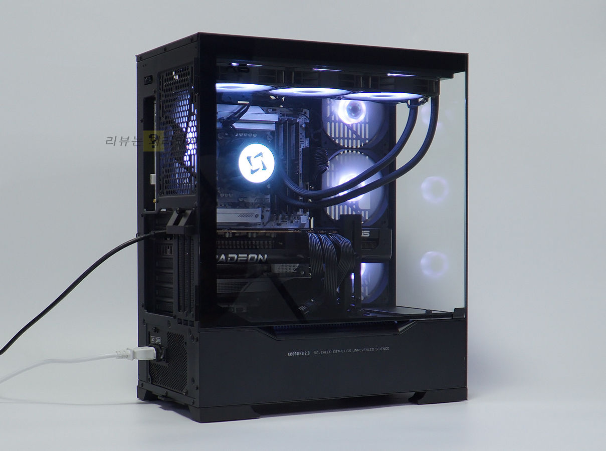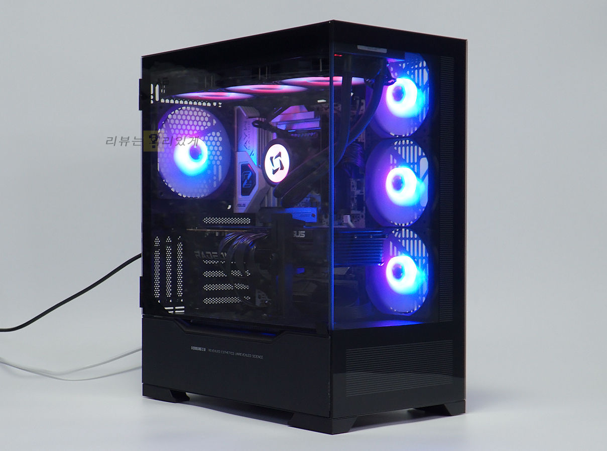 전면과 측면에 강화유리 패널을 사용한 어항 케이스 방식으로 2면 파노라마 뷰를 볼 수 있다는 특징이 있습니다. 이것을 제외하면 전면 메시 패널을 사용한 이전 컴퓨터 케이스와 큰 차이는 없는 형태로 어항 케이스라는 방식에 심플함을 추가하였다 볼 수 있습니다. 덕분에 내부에 조립된 PC 부품에서 점등 되는 조명 효과를 막힘없이 감상할 수 있게 되었습니다.