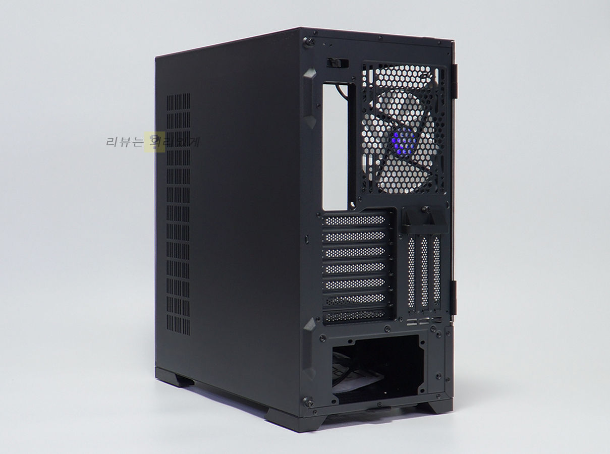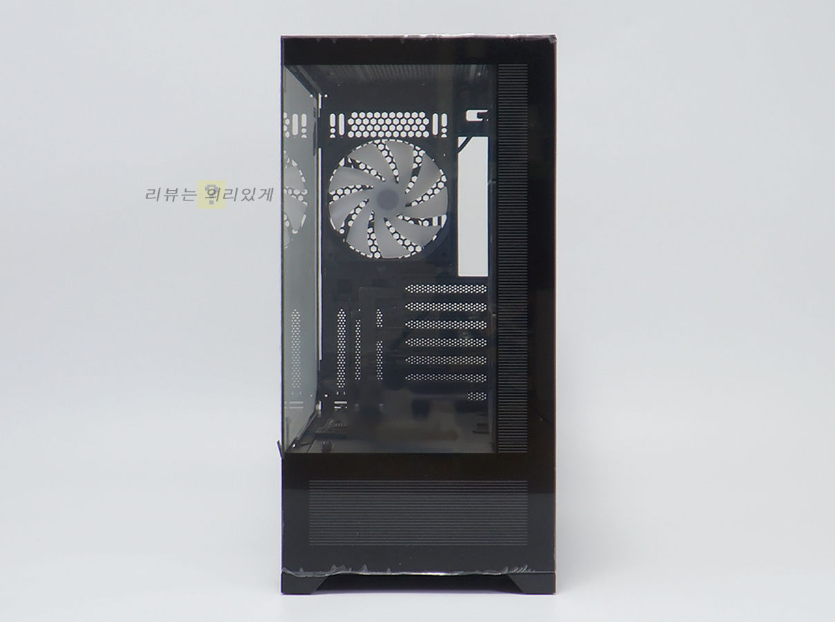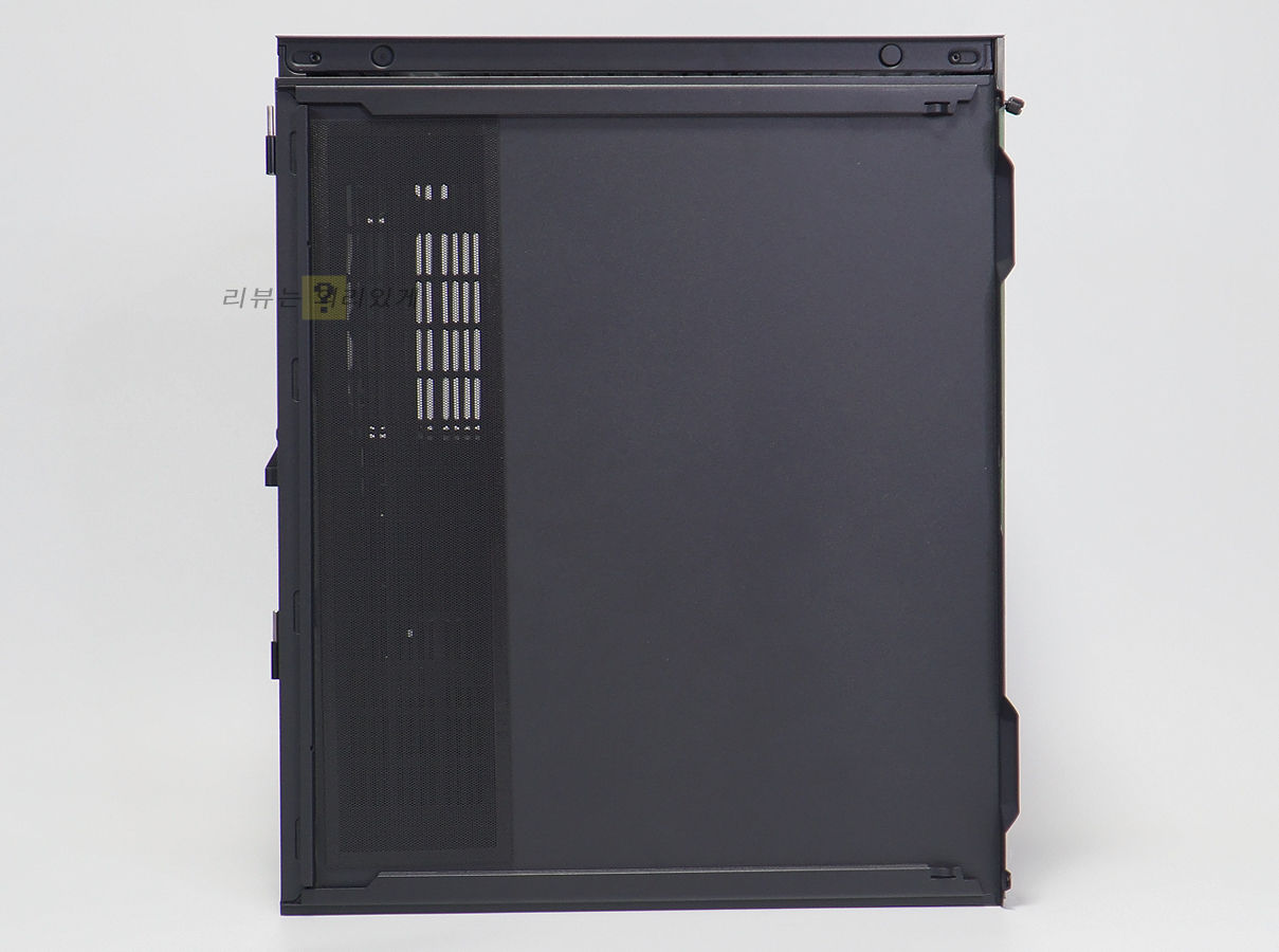 측면 또한 강화유리 패널과 일반 패널을 사용하였으며, 전면과 달리 측면 패널은 풀 사이즈가 아닙니다. 측면에는 쿨링팬이 장착되어 있기 때문에 세로 형태의 에어홀을 추가하였습니다.