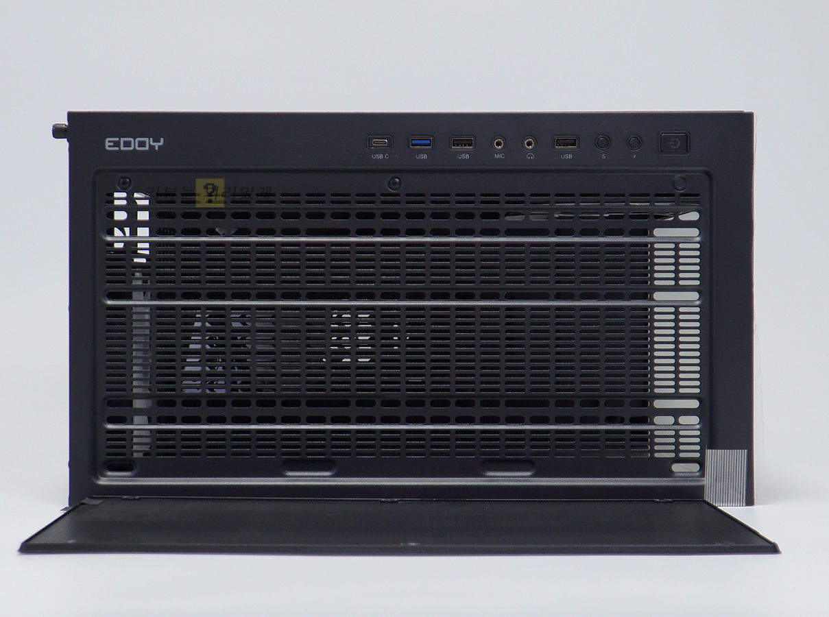 전면 강화유리 쪽에는 용도를 알 수 없는 덮개가 있는데 상품정보에서는 '전용 커버'라고 명명하고 있으나 전면에는 수랭 쿨러 장착이 되지 않는 구조인데다 굳이 돌출된 형태라서 필요한 요소는 아닙니다. 아마도 EDDY A6은 A7과 같은 프레임을 공유하는 모델인데 전면 메시 패널 구조로서 쿨링팬 및 수랭 쿨러 장착이 되기 때문에 EDDY A6에서는 사용할 수 없는 공간이나 A7과의 호환 때문에 이 형태를 그대로 유지한 것으로 보입니다.