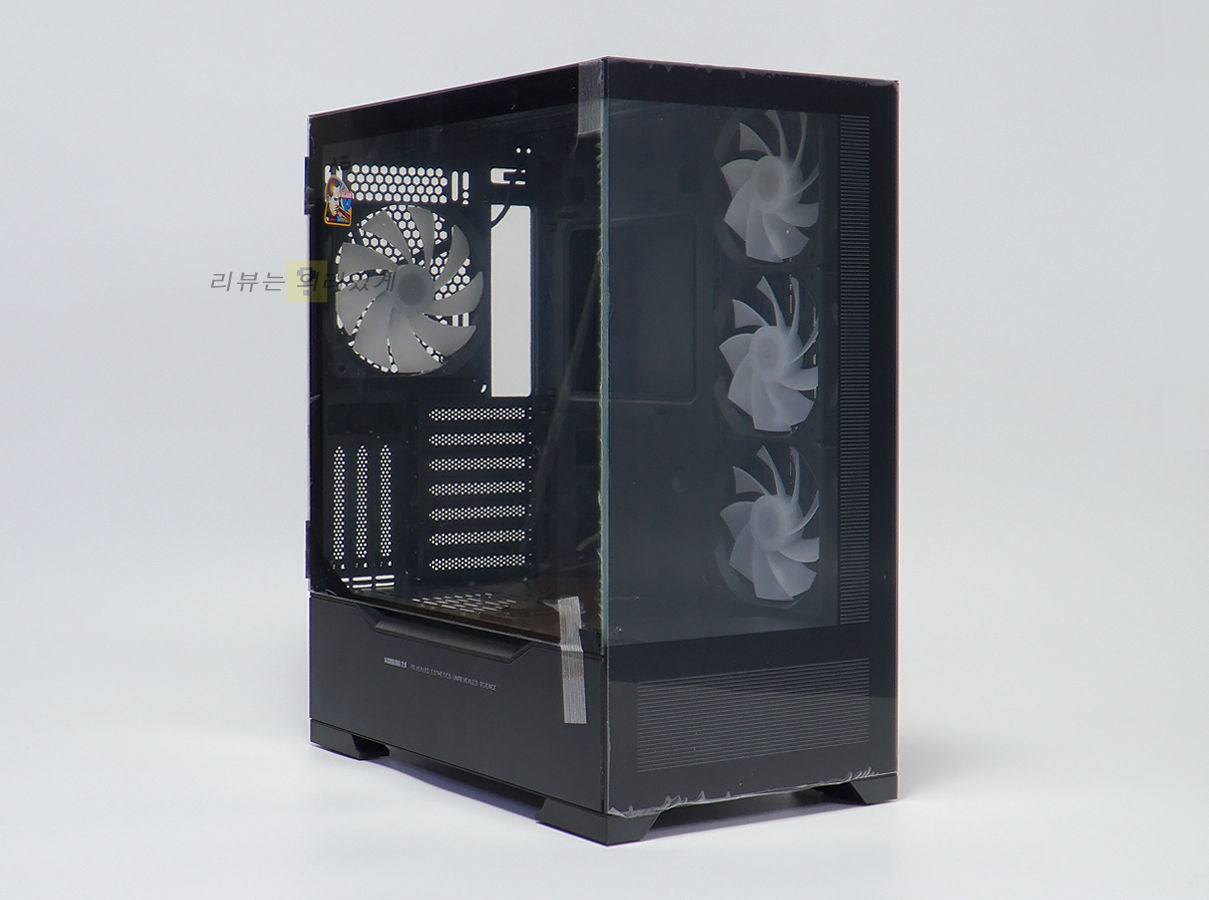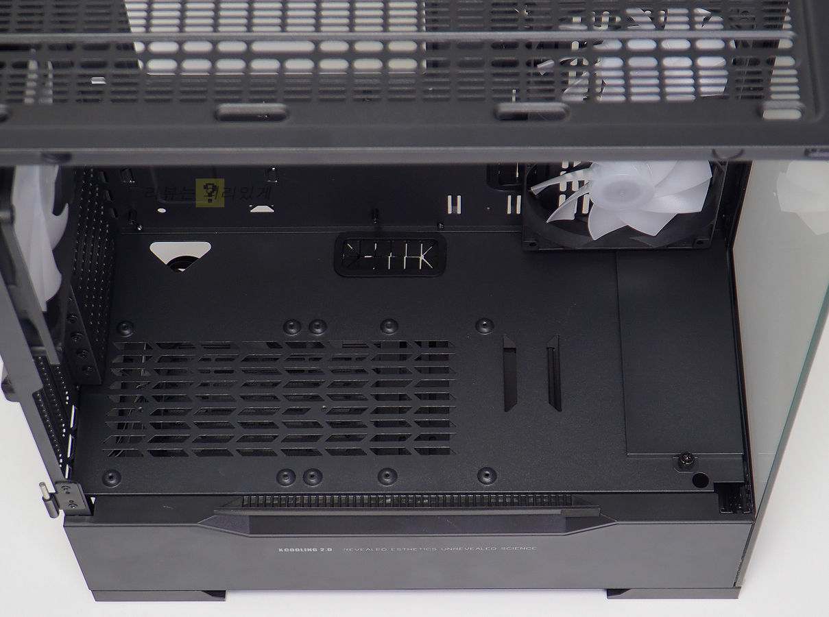 전면 강화유리 패널을 사용하였기 때문에 쿨링팬 장착은 지원하지 않습니다. 대신 측면에 쿨링팬을 장착할 수 있게 하여 부족한 쿨링을 보강하였습니다. 전면 전체가 강화유리를 사용하였는데 파워서플라이 체임버와 측면 일부에 가로 타입 스트라이프 패턴을 추가하였습니다. 이는 체임버와 측면의 케이블을 가리기 위함으로 보입니다.