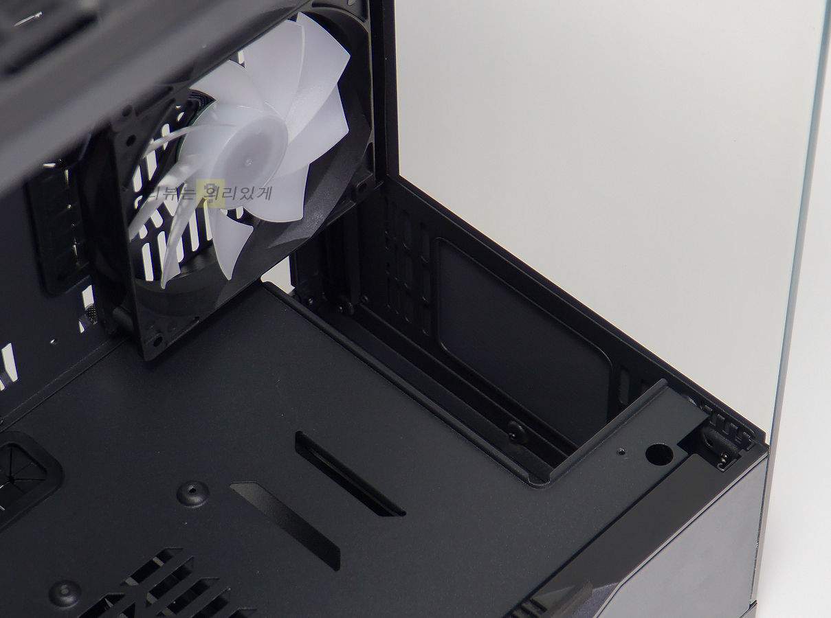 파워서플라이 체임버에는 120mm 팬 2개를 장착할 수 있는 공간과 그래픽카드 지지대를 고정시킬 수 있는 홀을 확인할 수 있습니다.