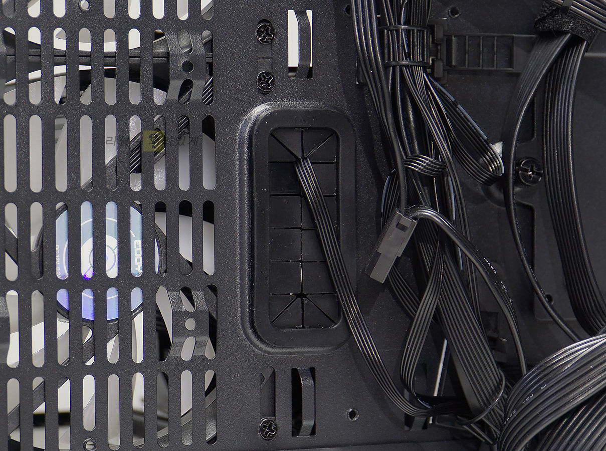 선정리 홀에는 커버가 부착된 방식이 사용되었습니다. 메인보드의 사이즈에 따라 달라지겠으나 ATX 메인보드를 장착하였을 때 측면과 하단 선정리 홀 일부를 가려 사용하기 불편하였습니다.