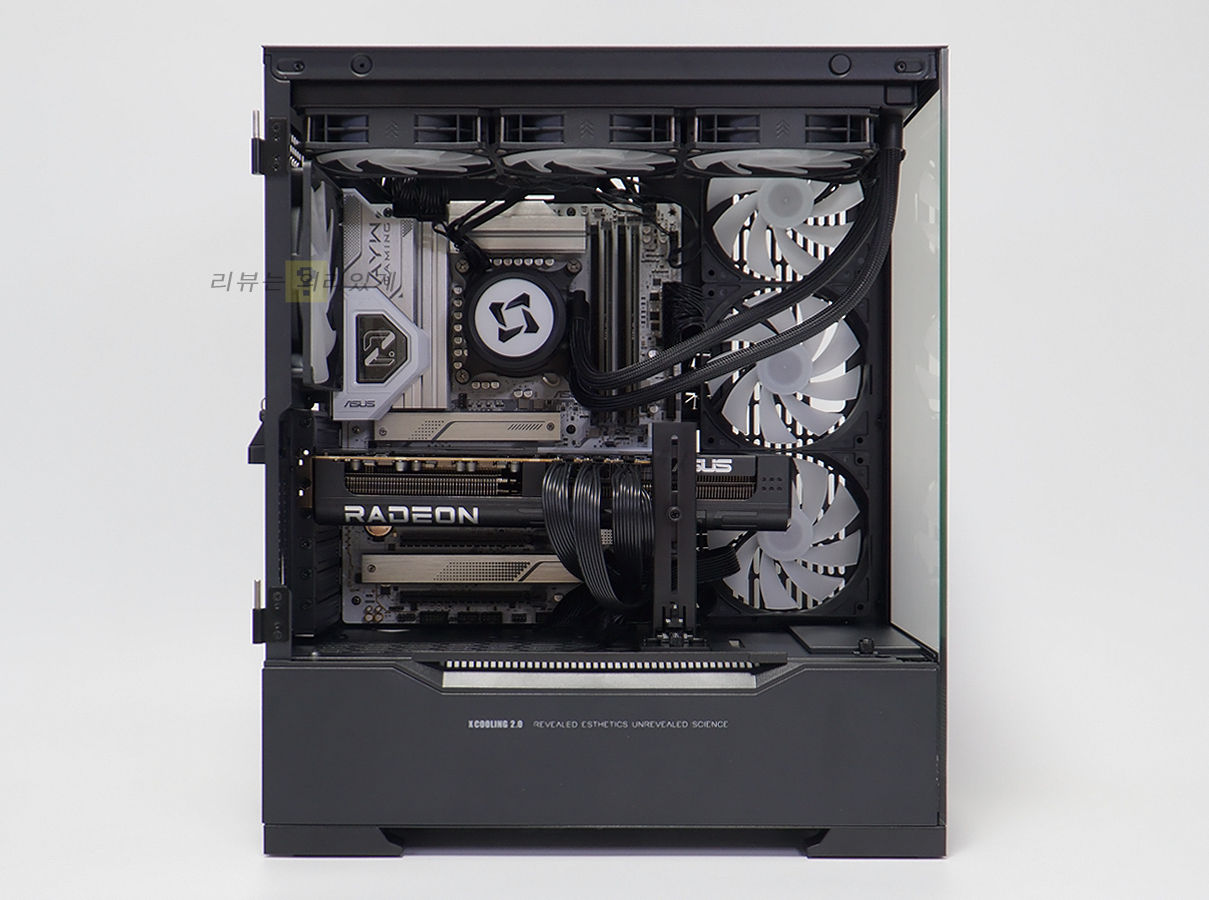수랭 쿨러는 상단 360mm, 280mm, 240mm 장착을 지원하고 있으며 측면 120mm RGB 팬 3개, 후면 140mm RGB 팬 1개를 제공하고 있습니다. 수랭 쿨러를 최대 360mm까지 장착할 수 있으나 여유 공간이 충분하지는 않습니다.