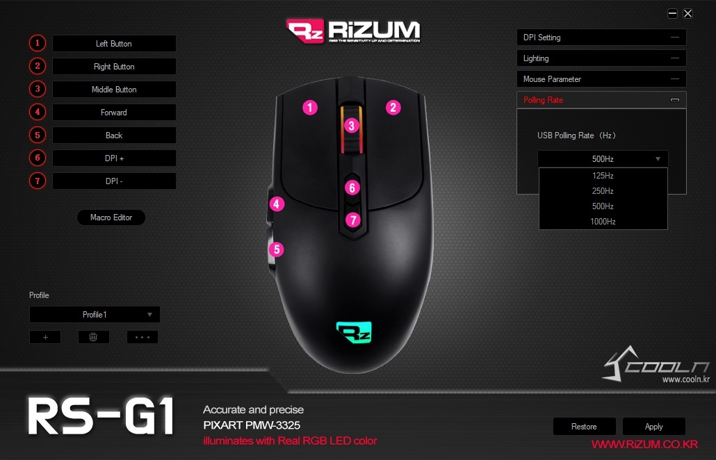 한 화면에서 모든 옵션을 지원하며 좌측 버튼, 메크로 우측 DPI, LED, 폴링레이트 같은 옵션으로 구분되어 있습니다.