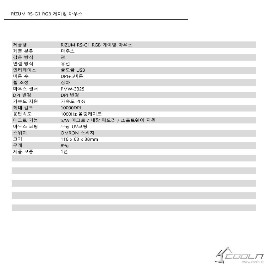 제조사 마다 고유의 디자인이나 특징이 존재합니다. 이것은 그 제조사만의 고유 특징이라 그것만 봐도 그 제조사를 떠올릴 정도로 상징하는 바가 큰 편 입니다. RIZUM RS-G1 RGB 게이밍 마우스는 기존 출시된 자사 마우스와 외형 상 큰 차이점은 없어 보이지만 외형 이라는 큰 틀은 거의 변하지 않았지만 LED 모드나 옵론 스위치 사용 등 내부 적인 변화를 볼 수 있는 제품이라 할 수 있습니다.