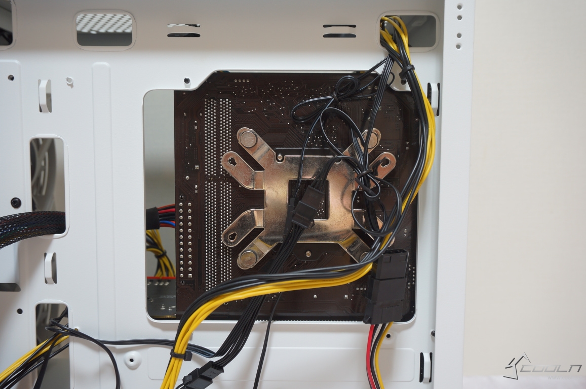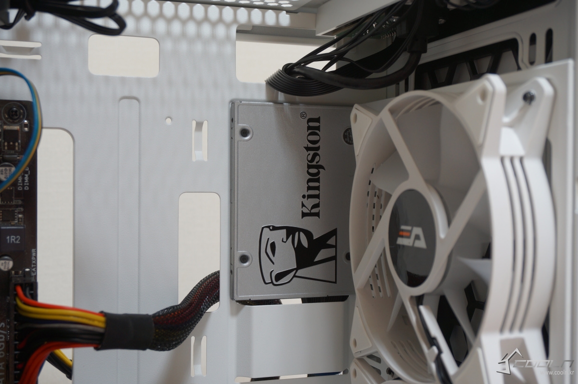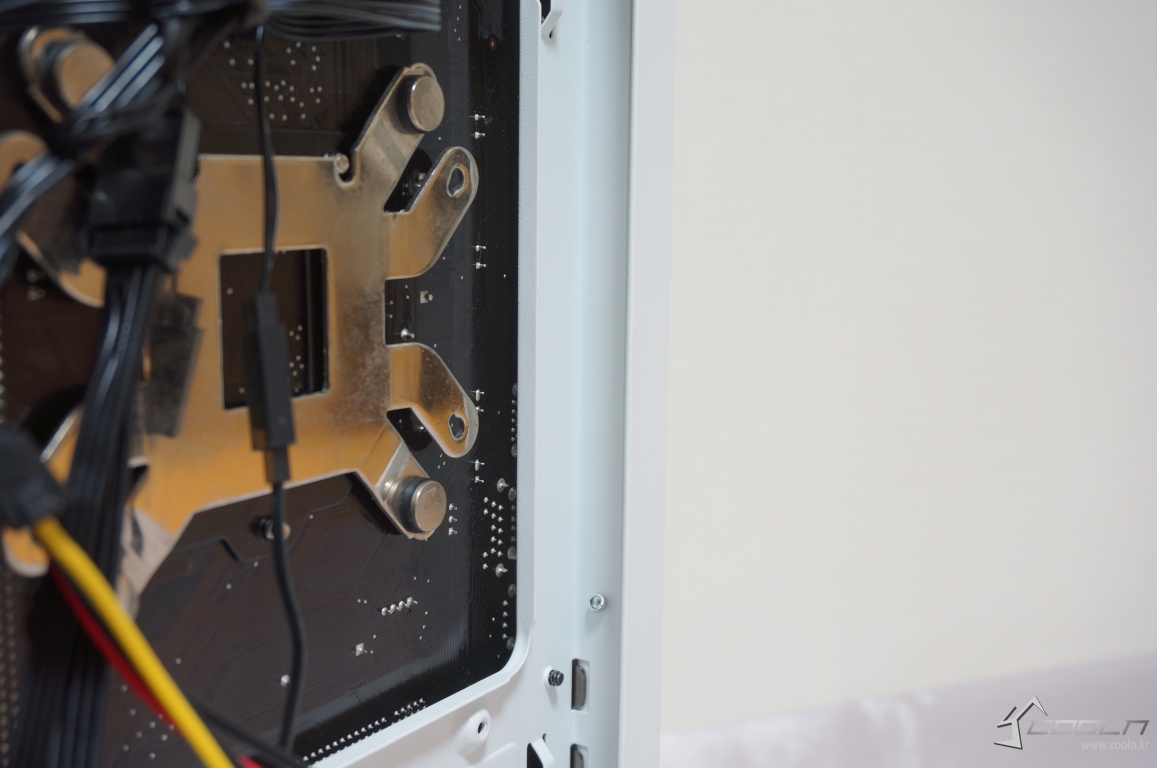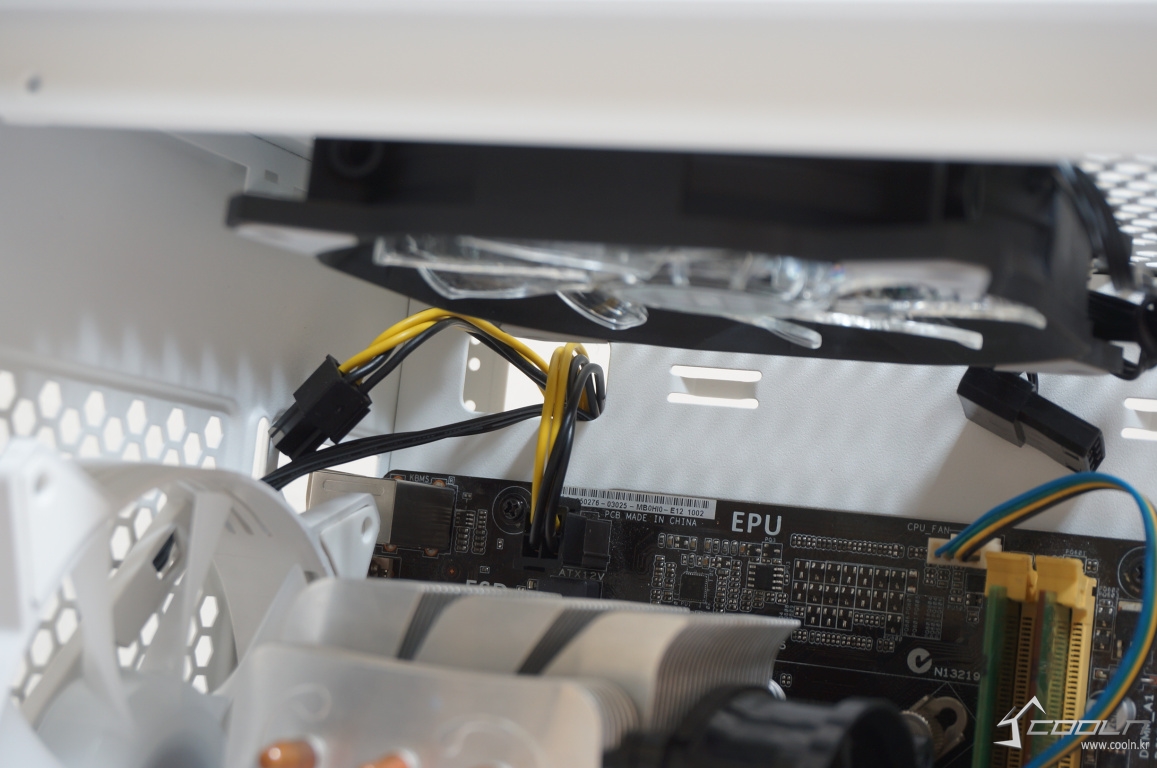 보조전원 선정리 홀이 메인보드 보다 위에 위치해 있어 조립 순서를 정하지 않아도 되며 앞서 언급한 쿨링팬 장칙시에도 충분한 공간 있음을 확인할 수 있었습니다.
