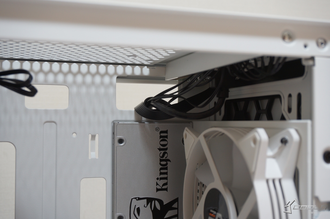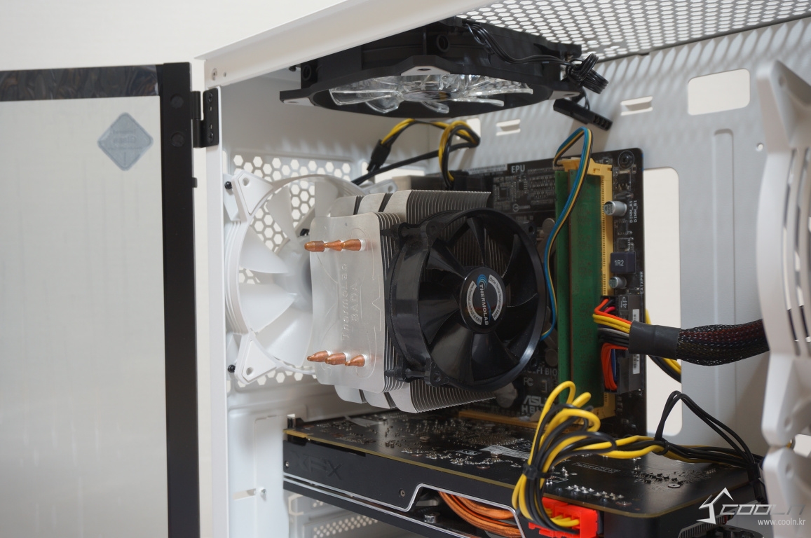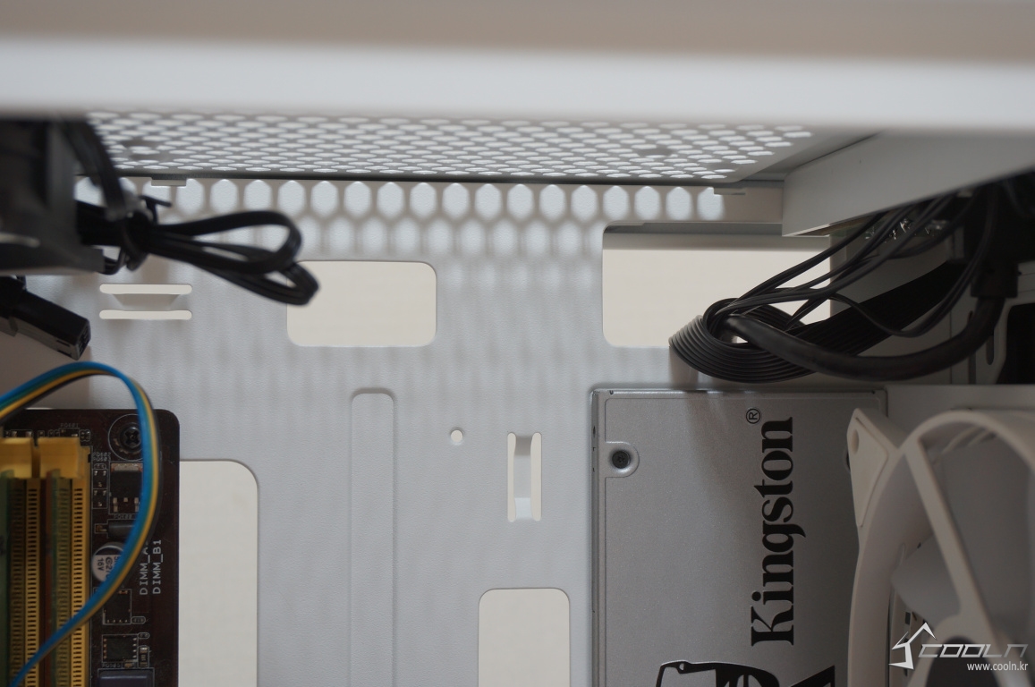 상단부에 쿨링팬을 장착하였을 때 선정리 홀과의 간섭은 발생하지 않았습니다.
