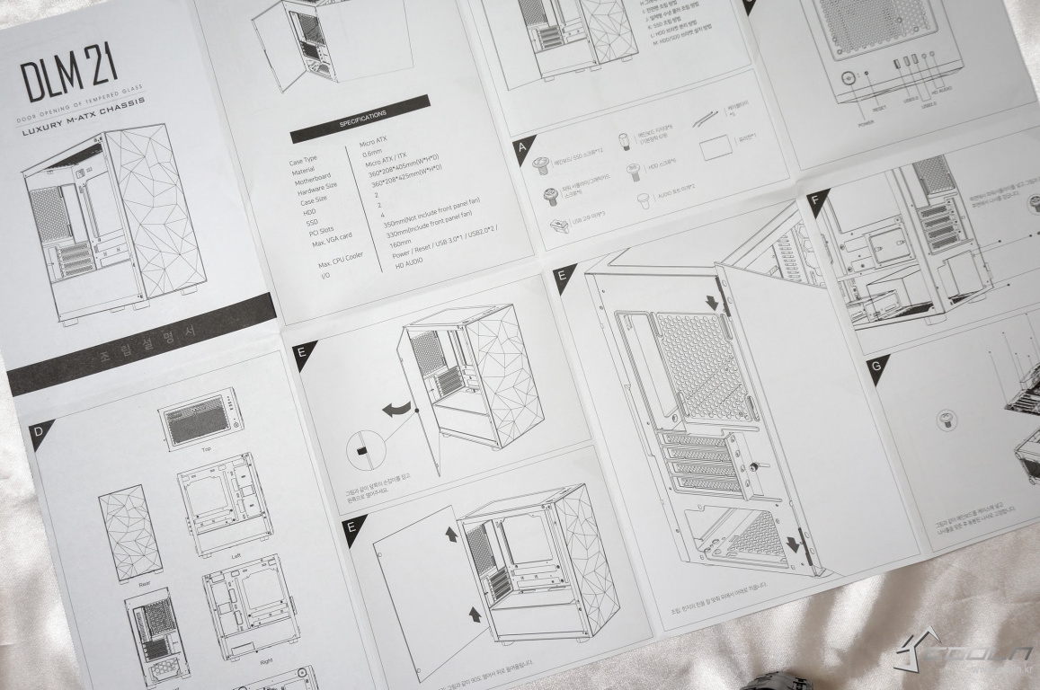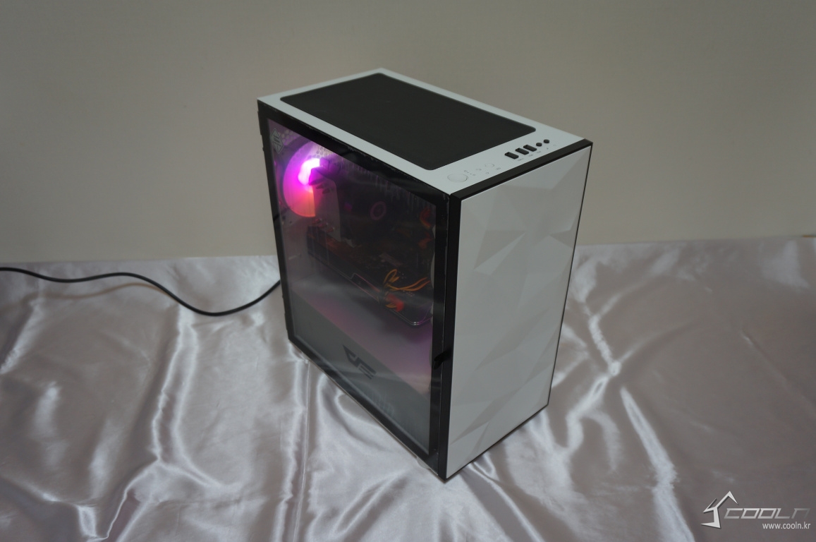 darkFlash DLM21 RGB 강화유리는 기존 보급형 케이스와 동일한 강화유리와 내부 LED 튜닝 요소를 모두 느낄 수 있는 무난한 보급형 케이스라 할 수 있습니다. 그러나 측면도어형 강화유리 패널과 전면 로우폴리 패턴이 조립과 제품 사용에 편리함과 특이성을 추가시켜 이 케이스만의 독특한 분위기를 연출하고 있었습니다.