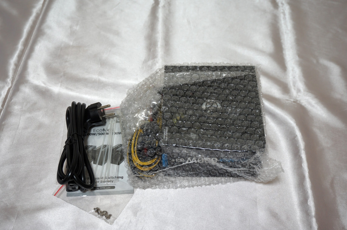 제품은 에어캡으로 보호하고 있으며 전원케이블, 조립나사, 케이블 타이를 구성품으로 제공합니다.
