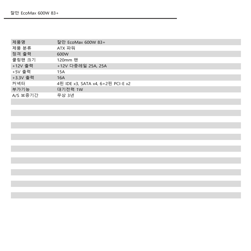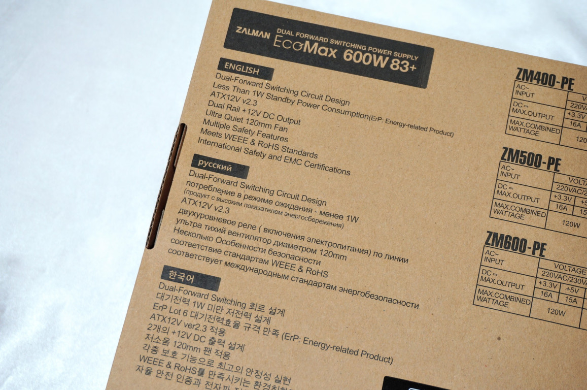 잘만은 우리에게 쿨러로 잘 알려져 있으나 쿨링 외에 PC파워도 판매하고 있습니다. 잘만 EcoMax 600W 83+는 일반적으로 많이 사용하는 500W, 600W로 나왔으며 80인증이나 엑티브PFC 같은 것이 없는 대신 보급형 가격대에 출시가 된것이 특징입니다.