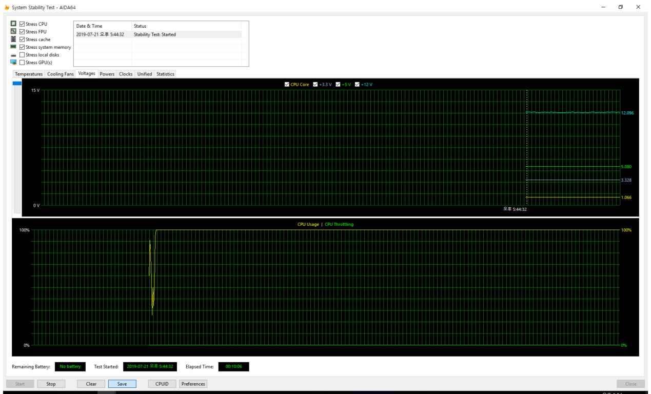 이후 간단하게 AIDA64로 전압 측정을 진행하였습니다.