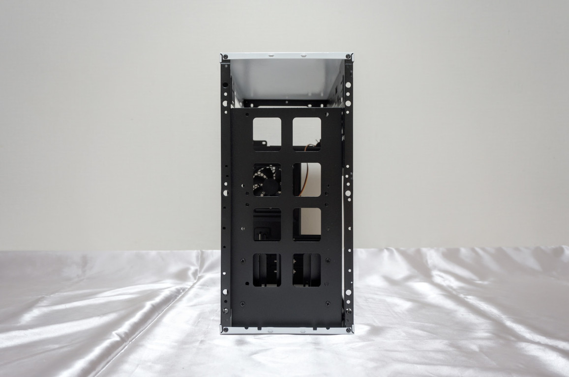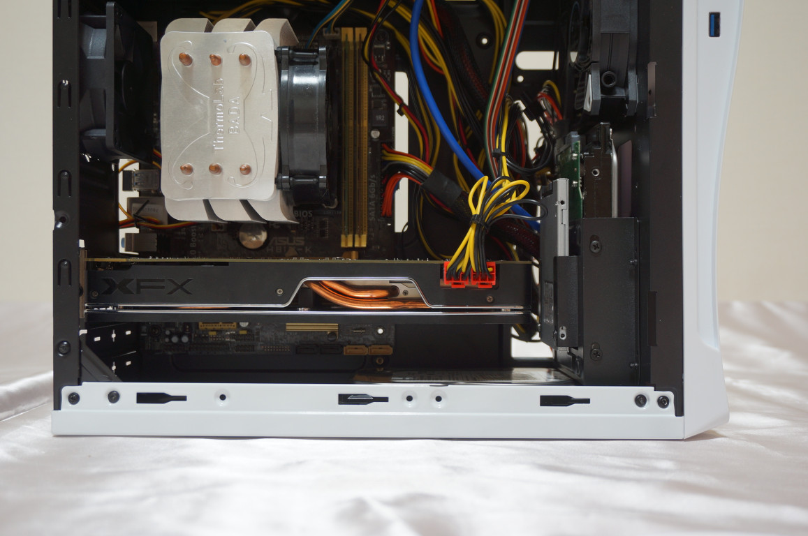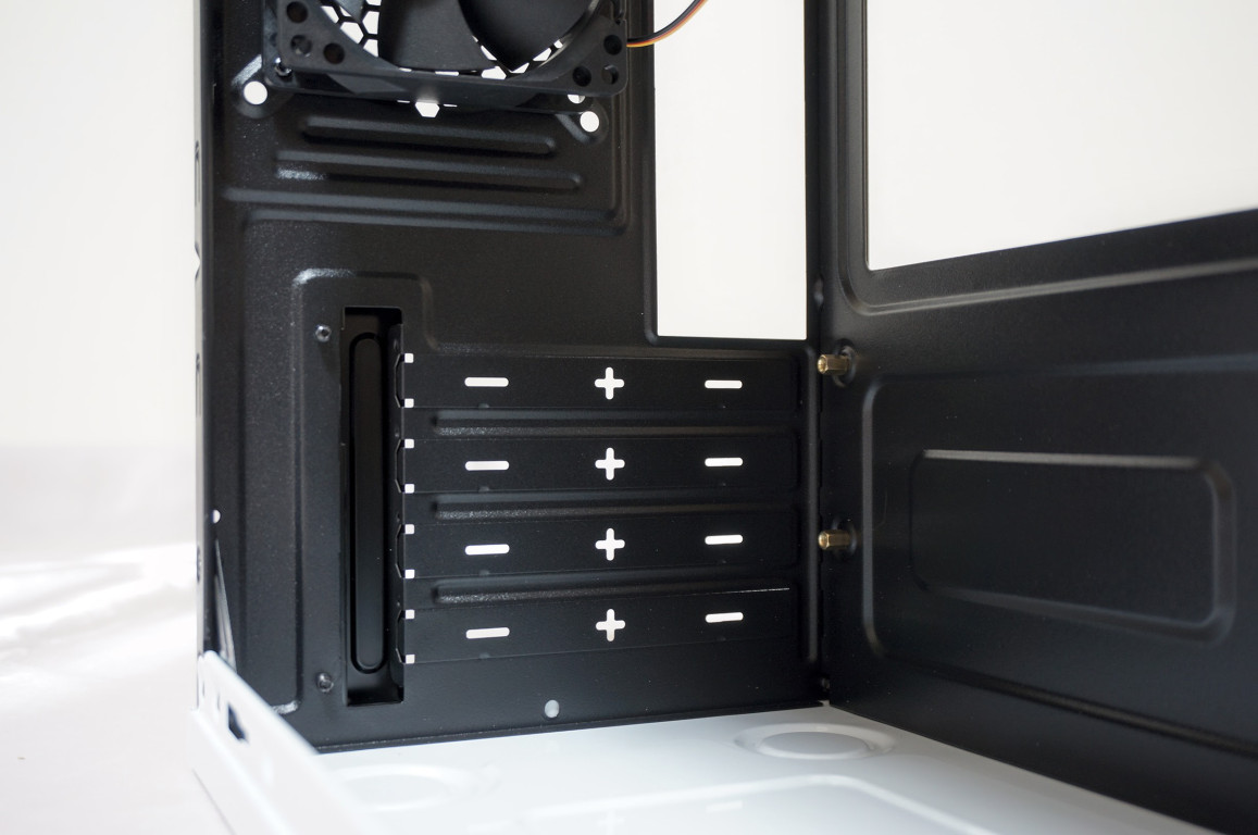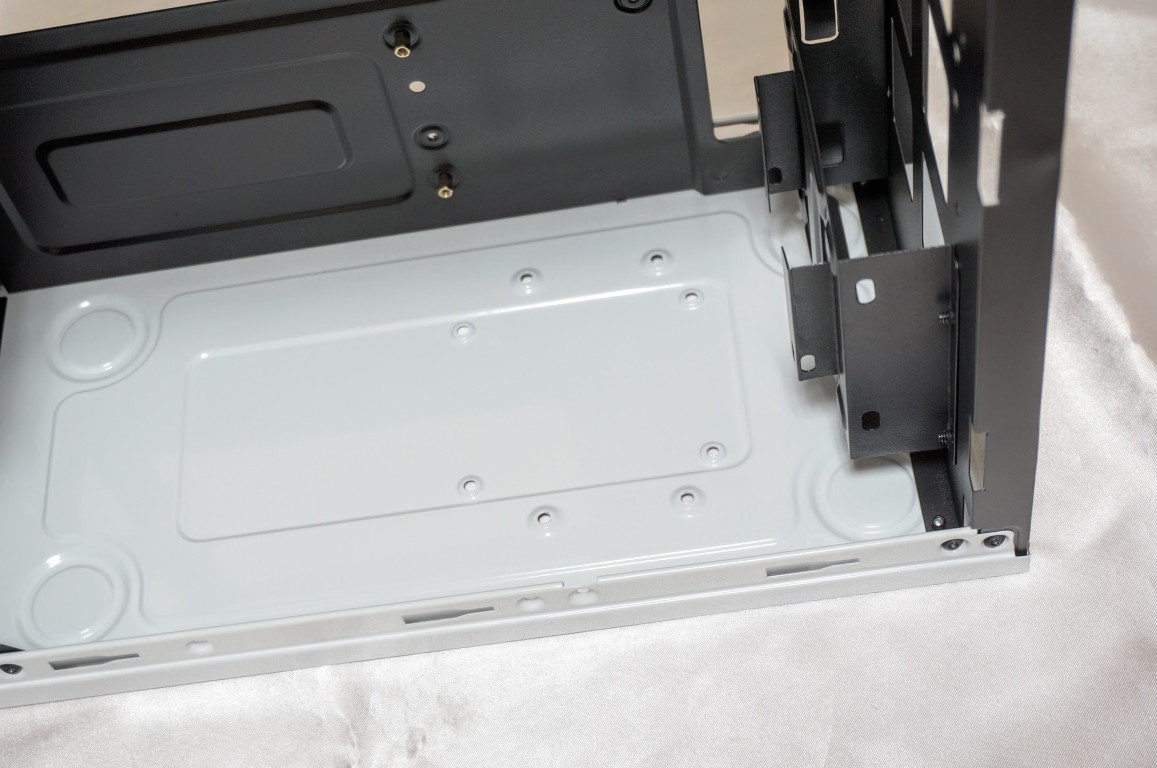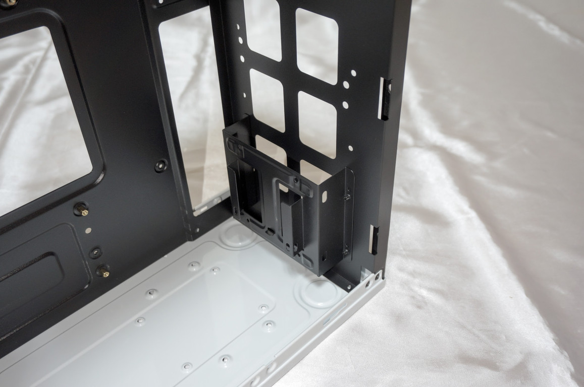 외형이 복고풍이라 생각되었다면 내부는 최대한 공간을 넓게 사용하고자 하는 노력이 보이는 편. 저장장치 가이드를 세워 장착 가능한 VGA길이를 늘렸으며 측면에 아무것도 배치하지 않아 넓어 보이는 효과가 있습니다.