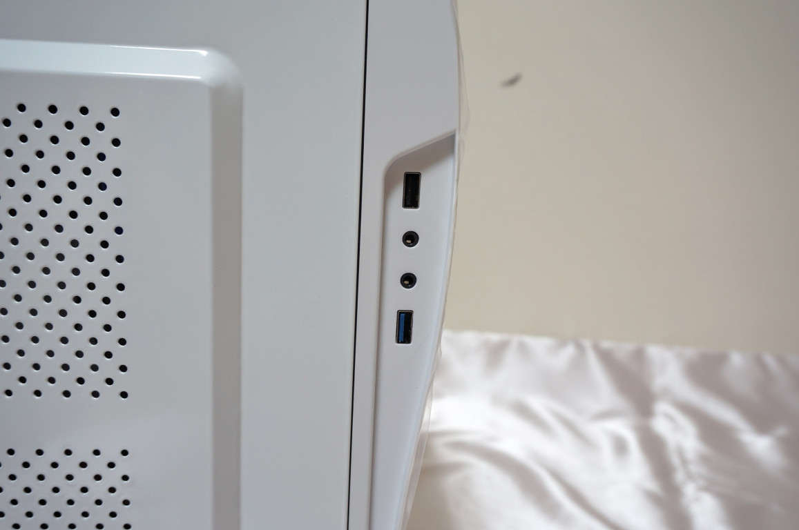 쿨링팬 추가 장착은 할 수 없으며 통풍구만 존재합니다. 또한 I/O 포트와 LED 컨트롤 버튼을 확인할 수 있습니다.