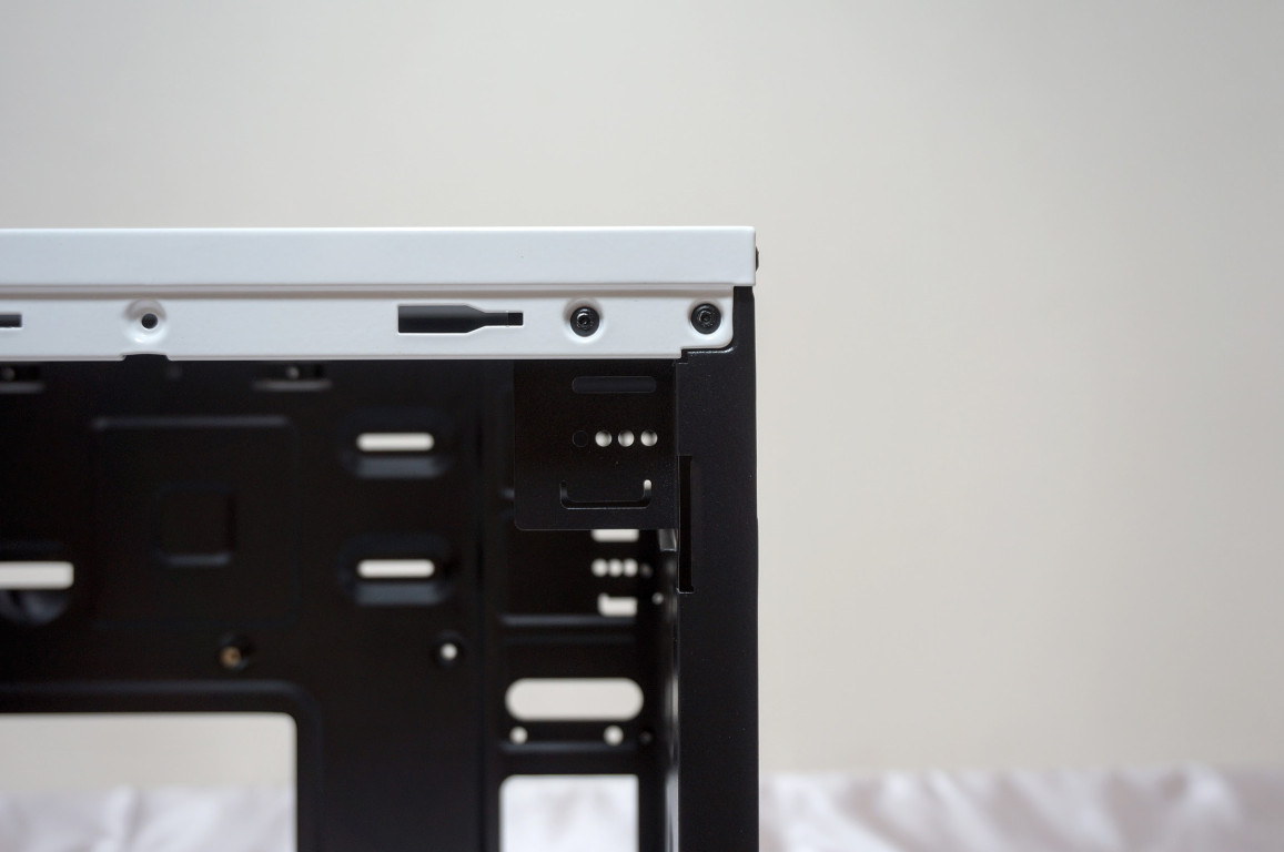 상단파워 방식일 경우 파워 옆에 선정리 홀을 제공하는 것이 기본적인 구조인데 특이하게도 아무것도 없습니다. 선정리 홀이 있어야 할 위치에는 5.25 설치 공간을 제공하고 있는데 전면부가 막혀있어 사용용도가 매우 제한적 입니다.