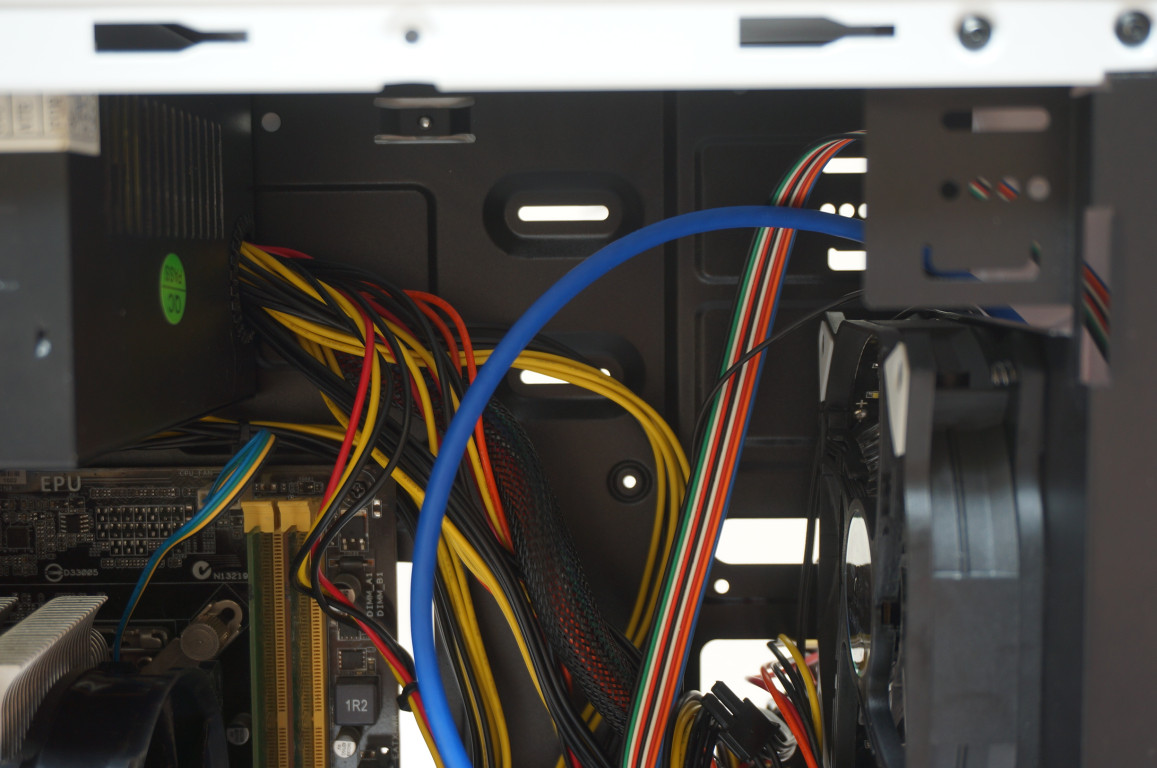 상단파워 장착 방식일 경우 바로 옆에 선정리를 하도록 선정리 홀을 만들어 놓습니다. 그러나 사용하기 어려운(전면 베젤이 막혀 있어) 5.25베이 때문에 선정리 홀이 없어 선정리가 어렵습니다.