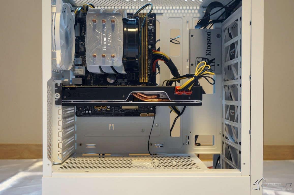 조립 방법은 기존 케이스와 큰 차이점이 없으며 저장장치 가이드는 손나사로 고정시키는 방법을 사용하여 탈 부착이 편리합니다. CPU 쿨러, 최대 VGA 장착 길이 또한 무난한 편.