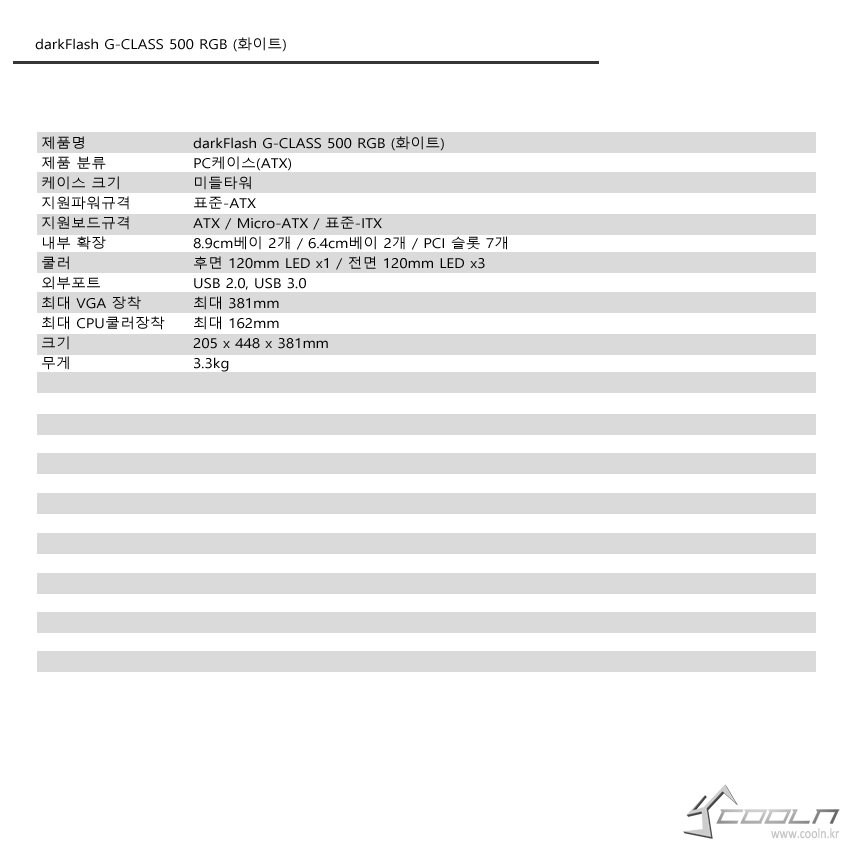G-CLASS 500은 기존 케이스에서 발전된 모습을 보여주는 것은 아니지만 동 가격대에서 몇 없는 LED 컨트롤 기능을 제공하여 특이점을 만들어 내었습니다. 미들 타워 치고는 그리 큰 편은 아니지만 측면 내부에 걸리는 부분이 없어 내부를 최대한 활용할 수 있으며 추가로 4개의 팬을 추가 장착할 수 있는 등 쿨링 또한 기대할만하다 생각합니다.