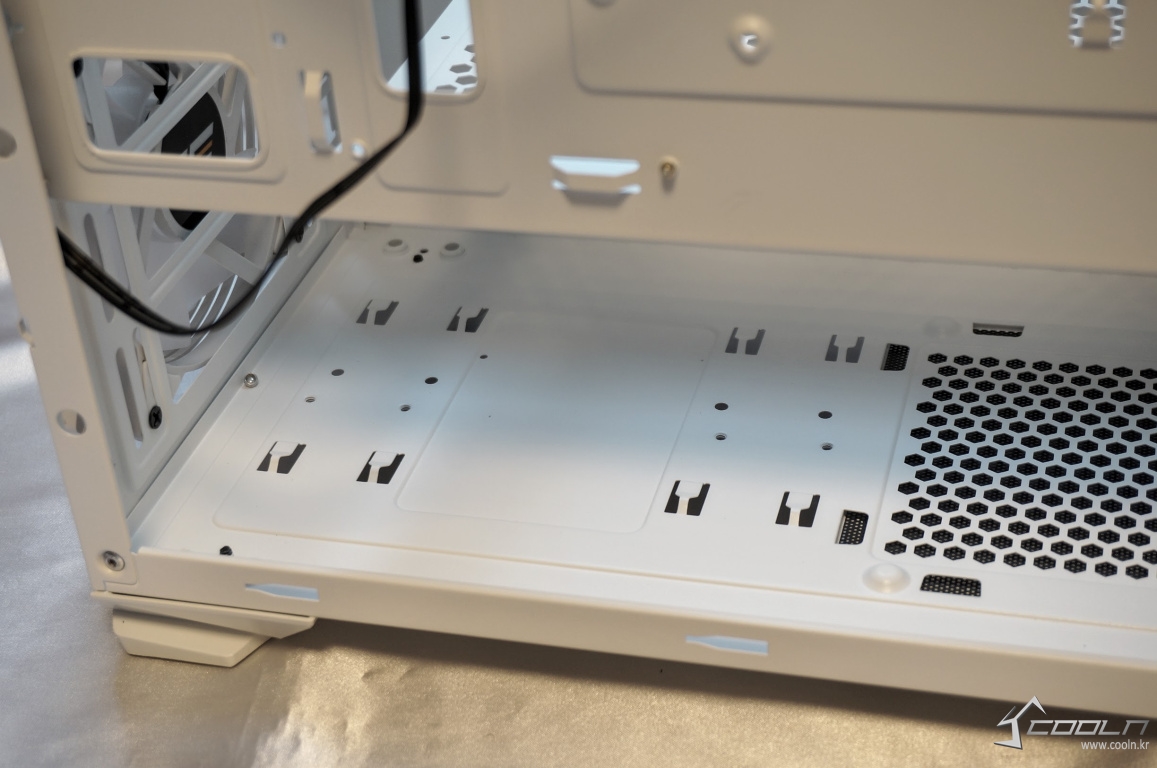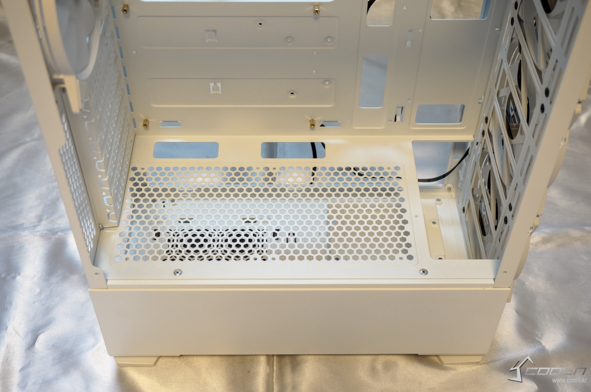 하단부 대부분이 벌집형 통풍구가 뚫려 있으며 120mm 팬 2개를 추가 장착할 수 있습니다.