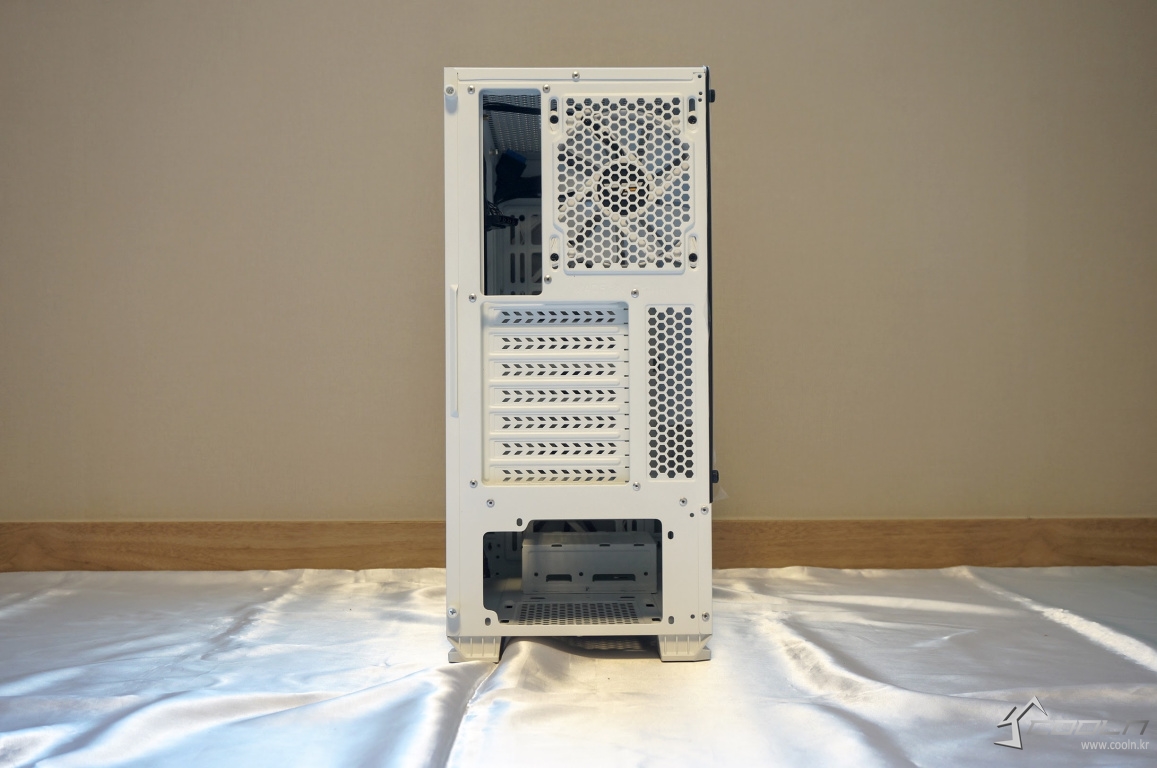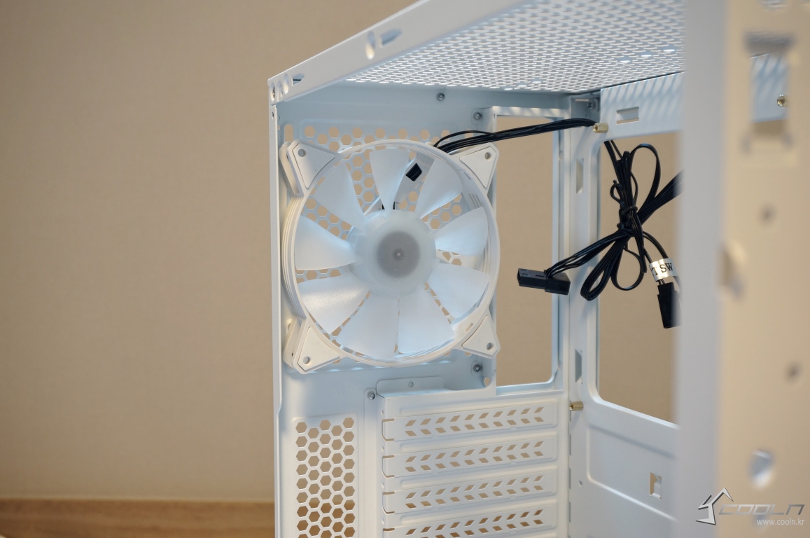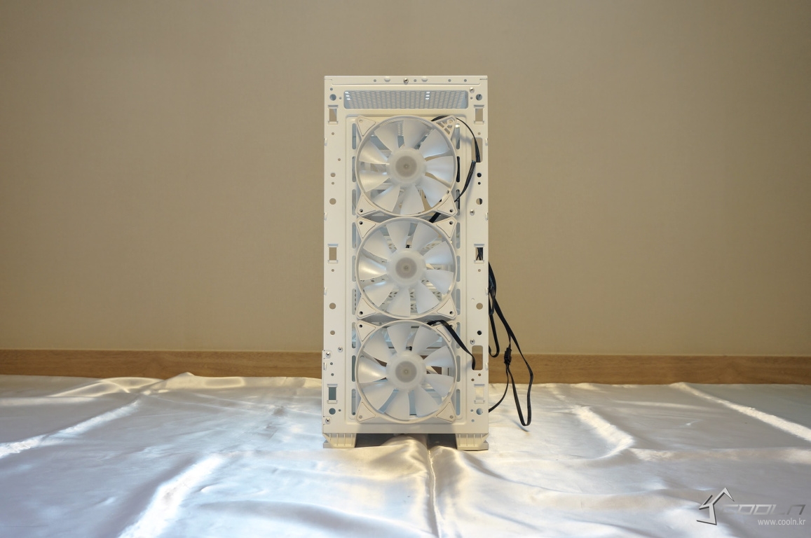잘 사용하지 않는 5.25베이를 제거하여 내부 공간을 최대한 활용할 수 있게 되었으며 내부 공간 또한 화이트 도색이 되어 있어 외,내부가 모두 일체감 있어 보입니다. 팬은 전면 3개, 후면 1개 총 4개를 제공하여 기본 쿨링도 무난한 편.