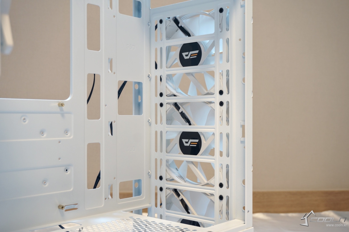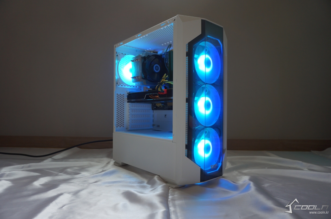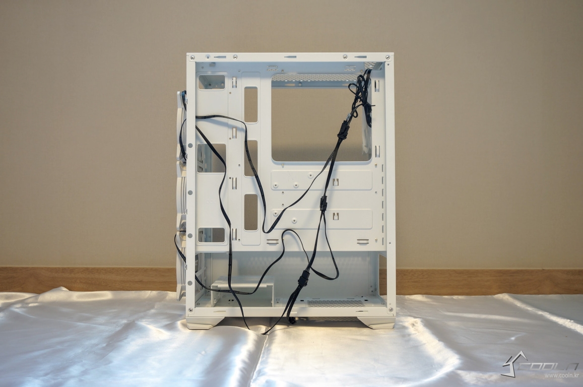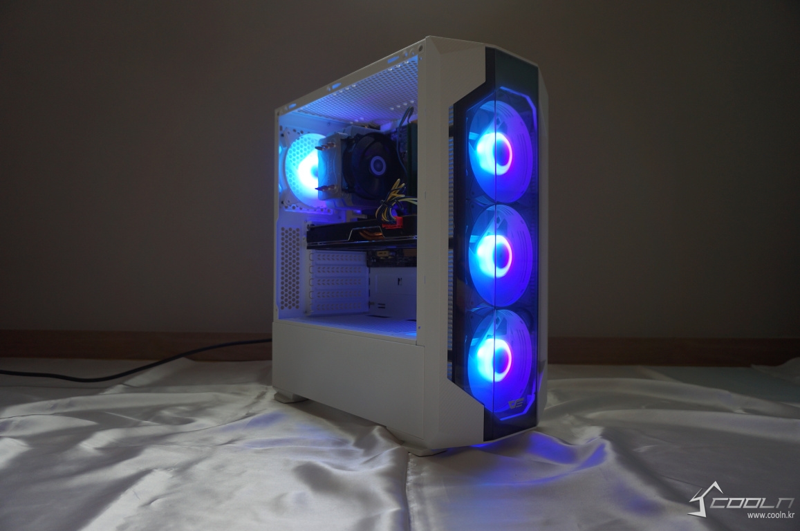 잘 사용하지 않는 5.25베이를 제거하여 내부 공간을 최대한 활용할 수 있게 되었으며 내부 공간 또한 화이트 도색이 되어 있어 외,내부가 모두 일체감 있어 보입니다. 팬은 전면 3개, 후면 1개 총 4개를 제공하여 기본 쿨링도 무난한 편.