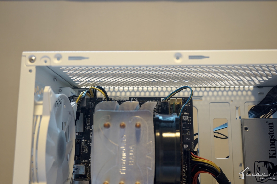 상단에 팬을 추가 장착하지는 않았으나 장착하였다고 가정했을 때 팬은 가장 나중에 조립하는 것이 좋아 보입니다.
