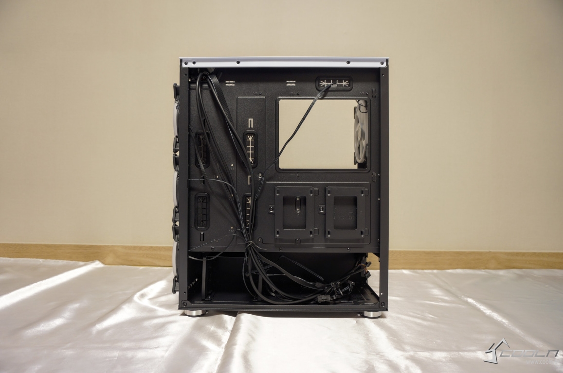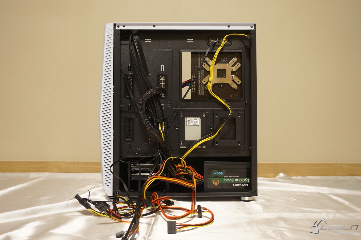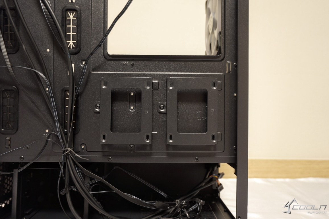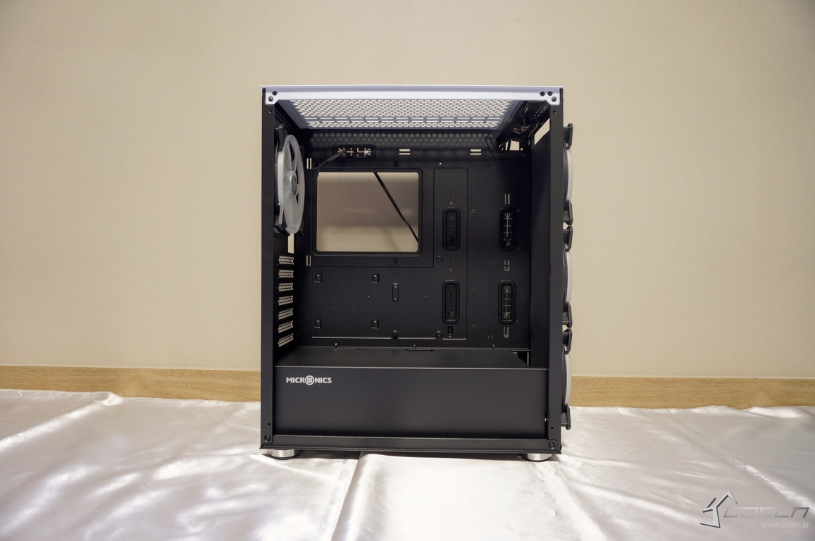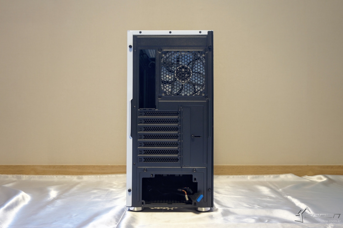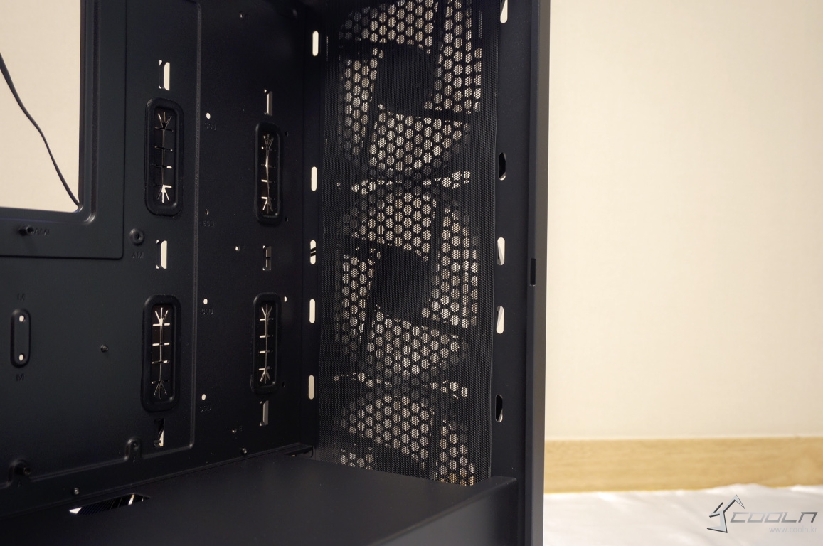전형적인 파워 서플라이 챔버 분리 구조이며 140mm팬 전면 3개 후면 1개가 제공되며 전면팬은 전면부 내부에 있습니다. 이 덕분에 VGA 장착시 팬과의 간섭이 줄어들게 되었으며 내부 공간을 최대한 활용할 수 있게 되었습니다.