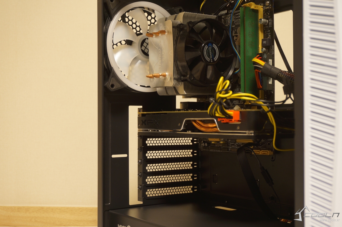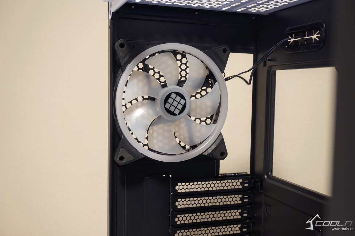 팬이 전면 내부에 장착되는 구조로 되어 있어 팬과 VGA간의 간섭은 발생하지 않습니다. 또한 이는 내부 공간을 더 사용할 수 있다는 것을 의미합니다.