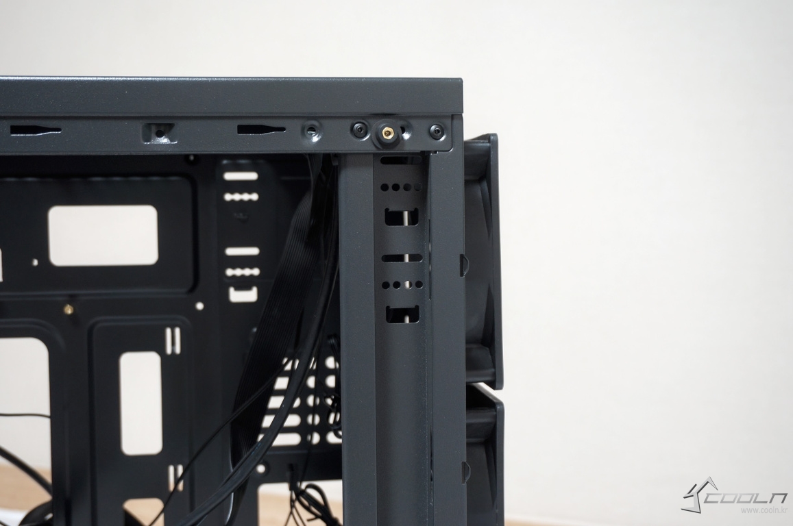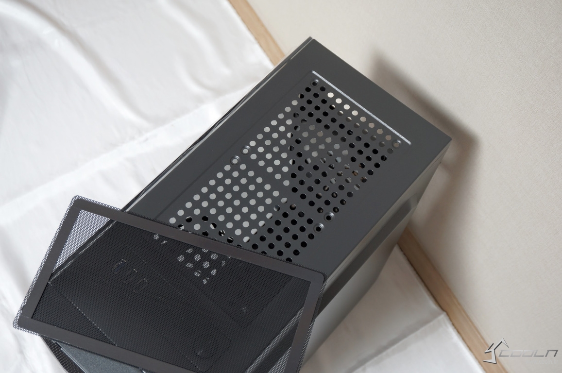 상단에는 자석식 먼지필터가 부착되어 있으며 120mm 팬 2개를 추가 장착할 수 있습니다.