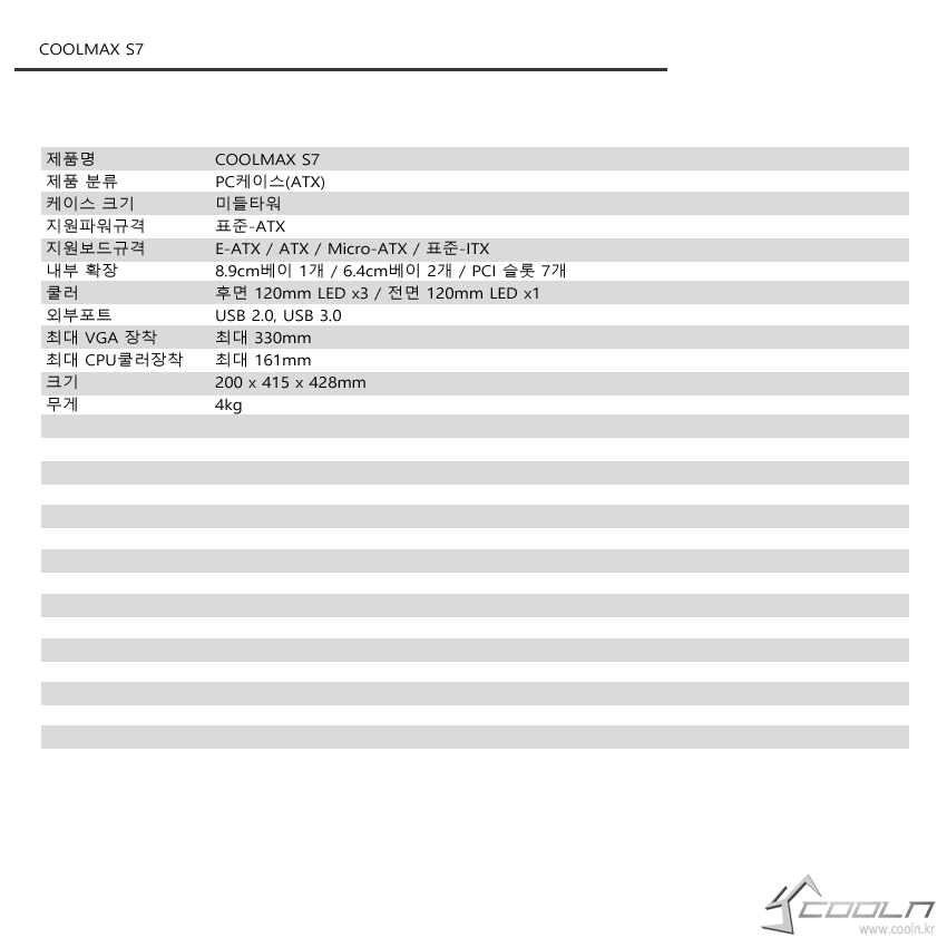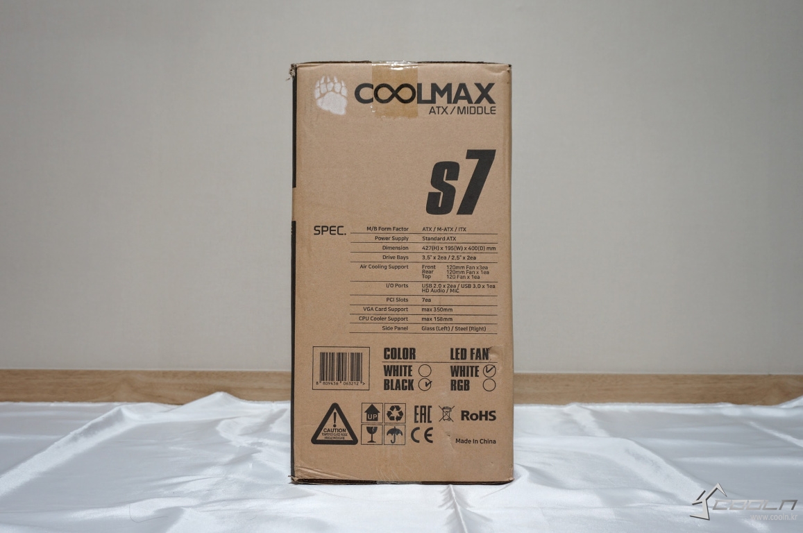 COOLMAX S7는 보급형 케이스 가격대에 크기가 적당히 작으면서도 미들타워의 확장성을 유지시키면서 측면은 강화유리가 부착되어 있는데 기본 장착되어 있거나 최대 장착 가능한 팬이 어느 정도 있는 케이스라고 말할 수 있는 제품 입니다.