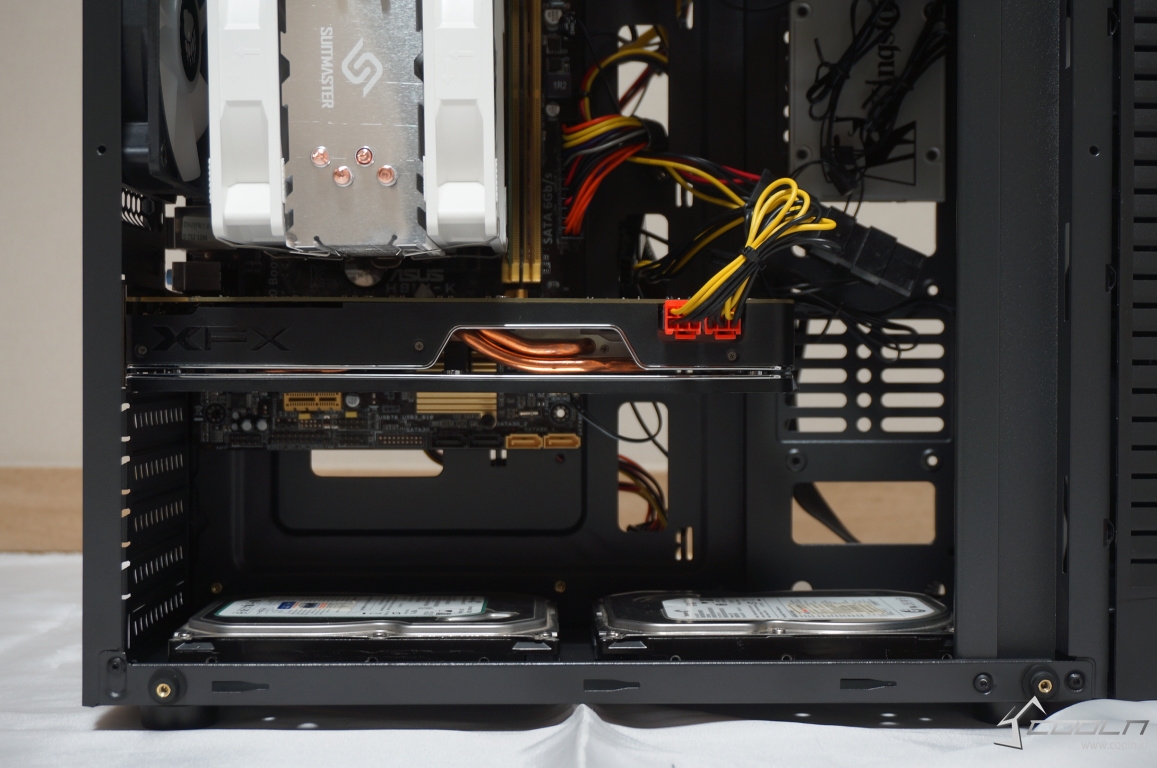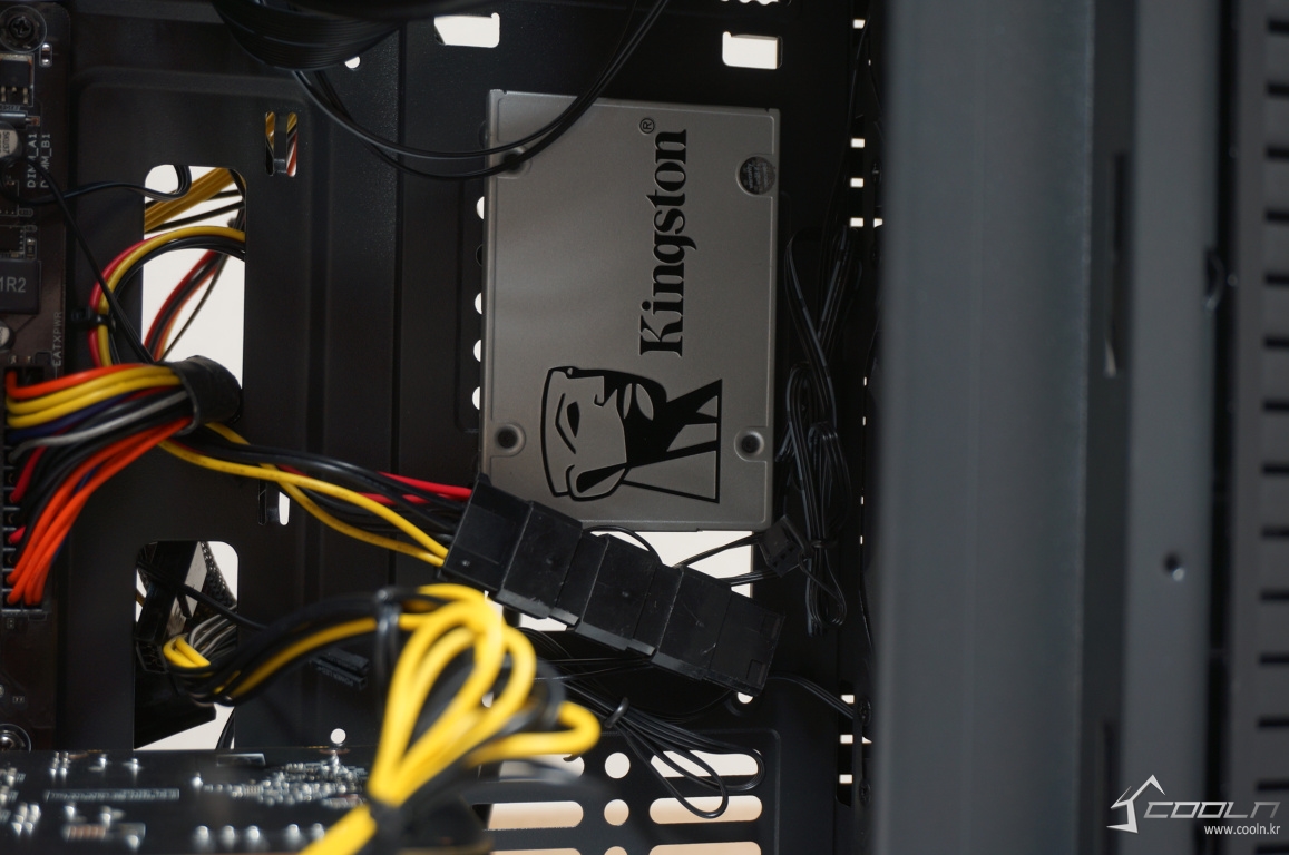바닥면에 장착할 수 HDD를 2개 장착할 공간을 제공하는 것으로 보았으나 하단부에 2개를 장착하게 되면 SATA 커넥터를 장착할 공간이 없어지게 됩니다.