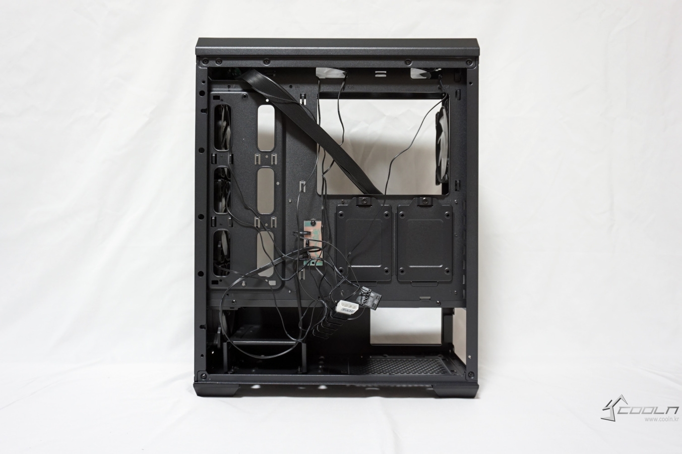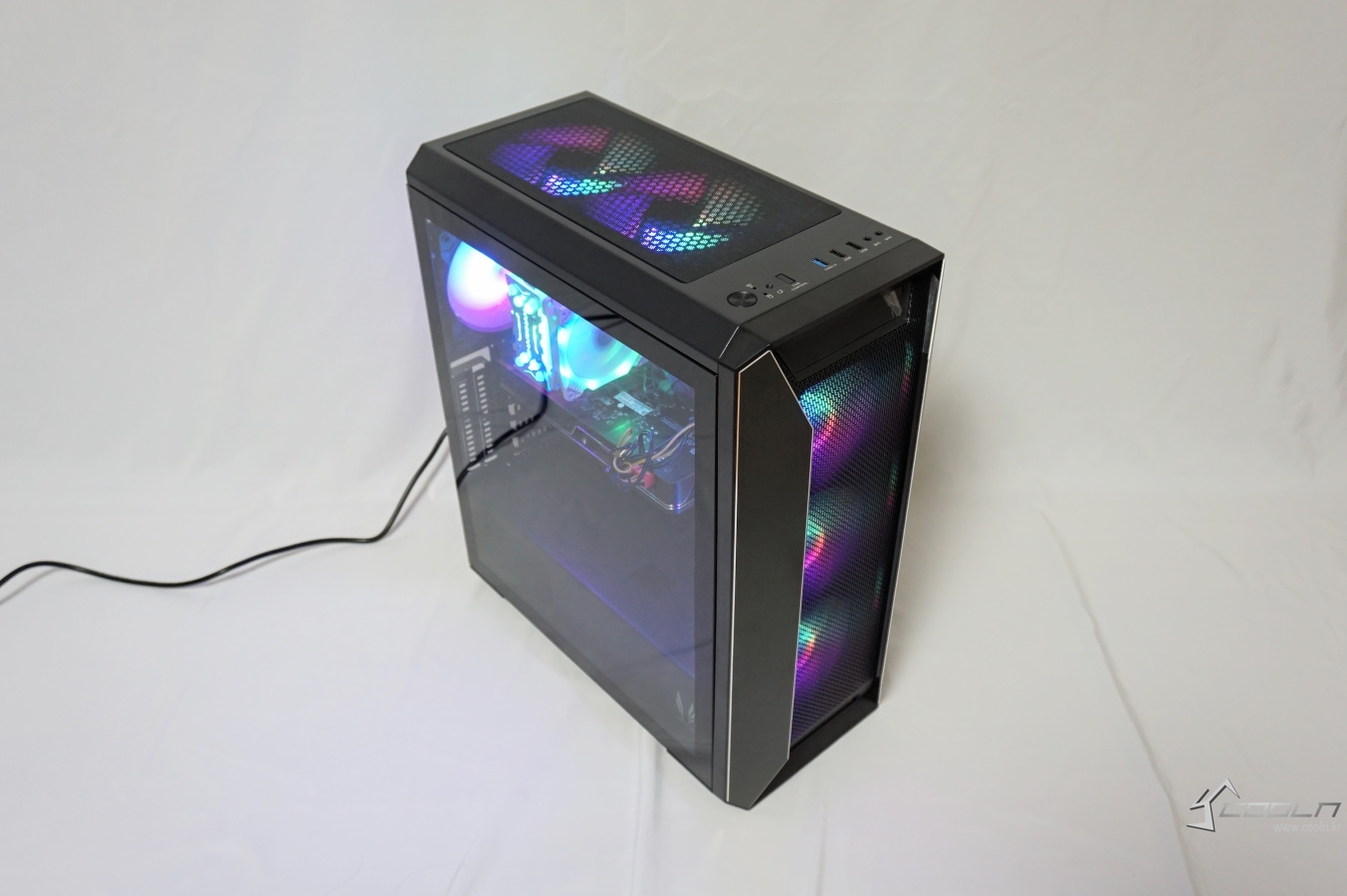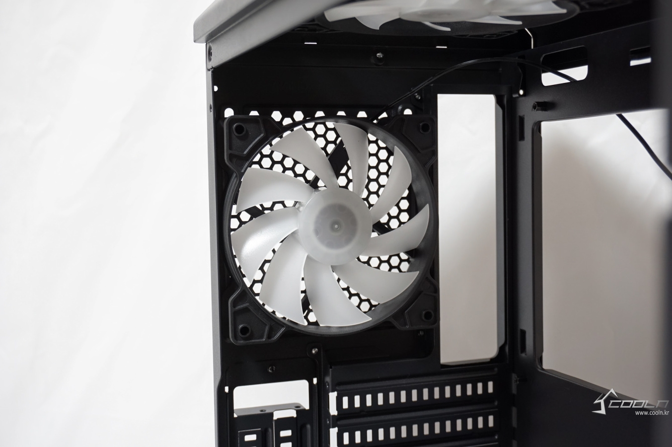자사의 MOON FAN 3 6개가 번들 쿨러로 제공되어 있어 이 상태에서도 추가 팬 장착 없이도 튜닝 효과를 누릴 수 있습니다. 최대 장착 가능한 팬이 6개 이니 최대치로 구성되었다 볼 수 있습니다. 측면 강화 유리에 스모그 처리가 약간 되어 있으나 LED는 그리 어둡다 생각되지 않았습니다. 팬 컨트롤러는 팬 속도 조절만 가능하기 때문에 LED 모드 변경은 되지 않습니다. 저속 모드 시 LED 밝기가 약간 차이가 있을 수 있습니다.