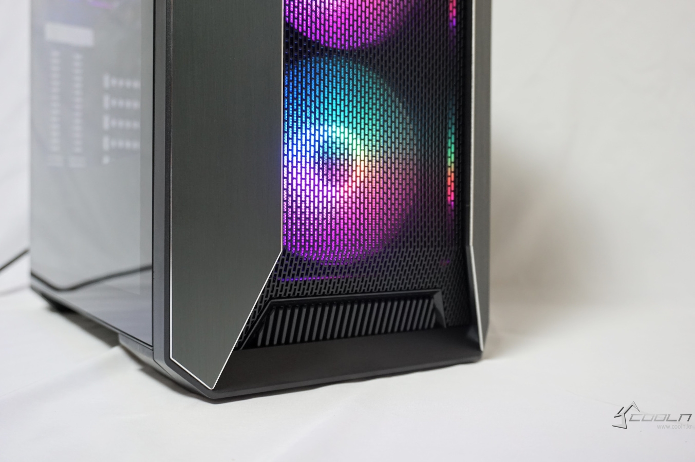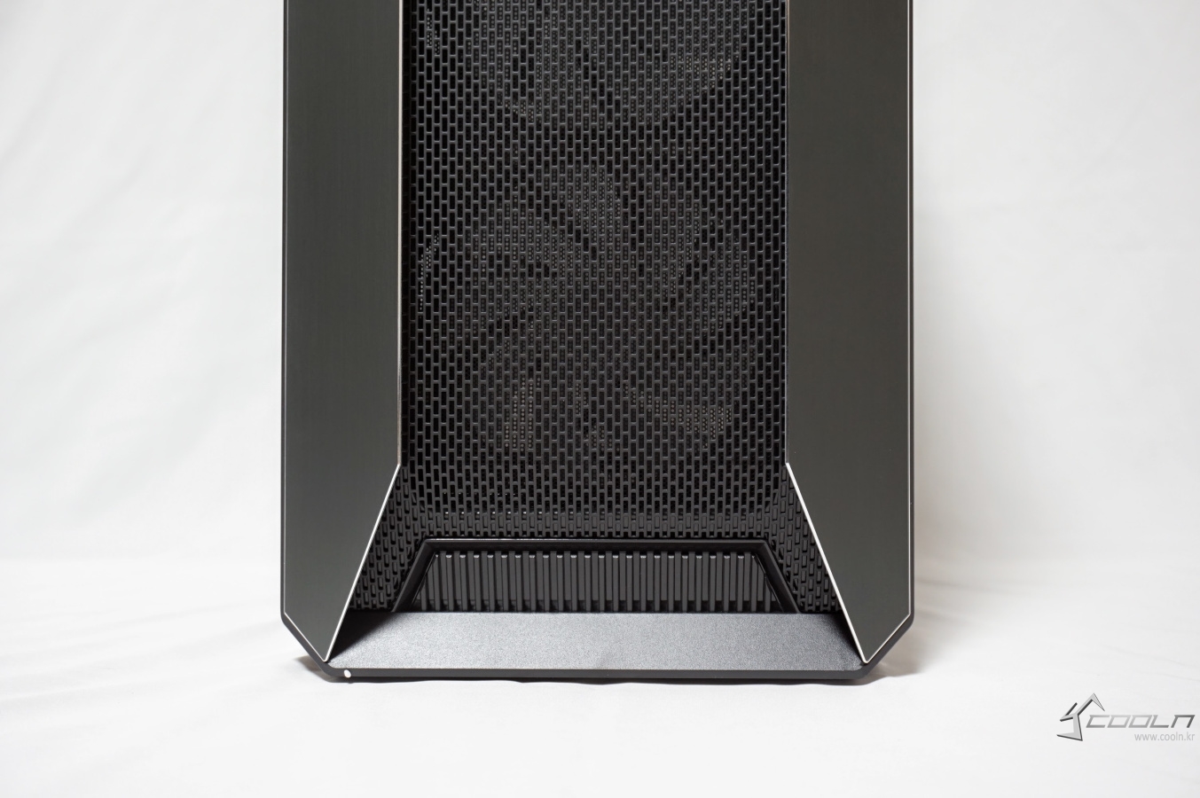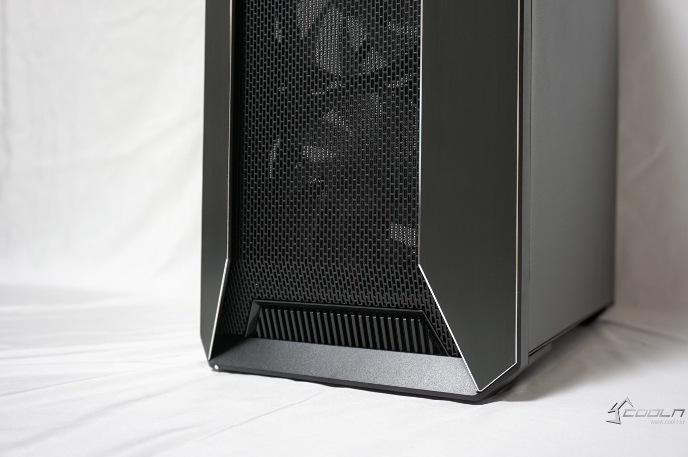 양쪽의 알루미늄 패널은 베젤 사이드를 감싸는 듯한 디자인으로 되어 있으며 이 패널과 베젤과의 약간의 틈이 있는 것을 확인할 수 있습니다. 또한 전면의 풀 사이즈 메쉬 타공망은 내부의 장착된 팬이 보일 정도로 비침이 있습니다.