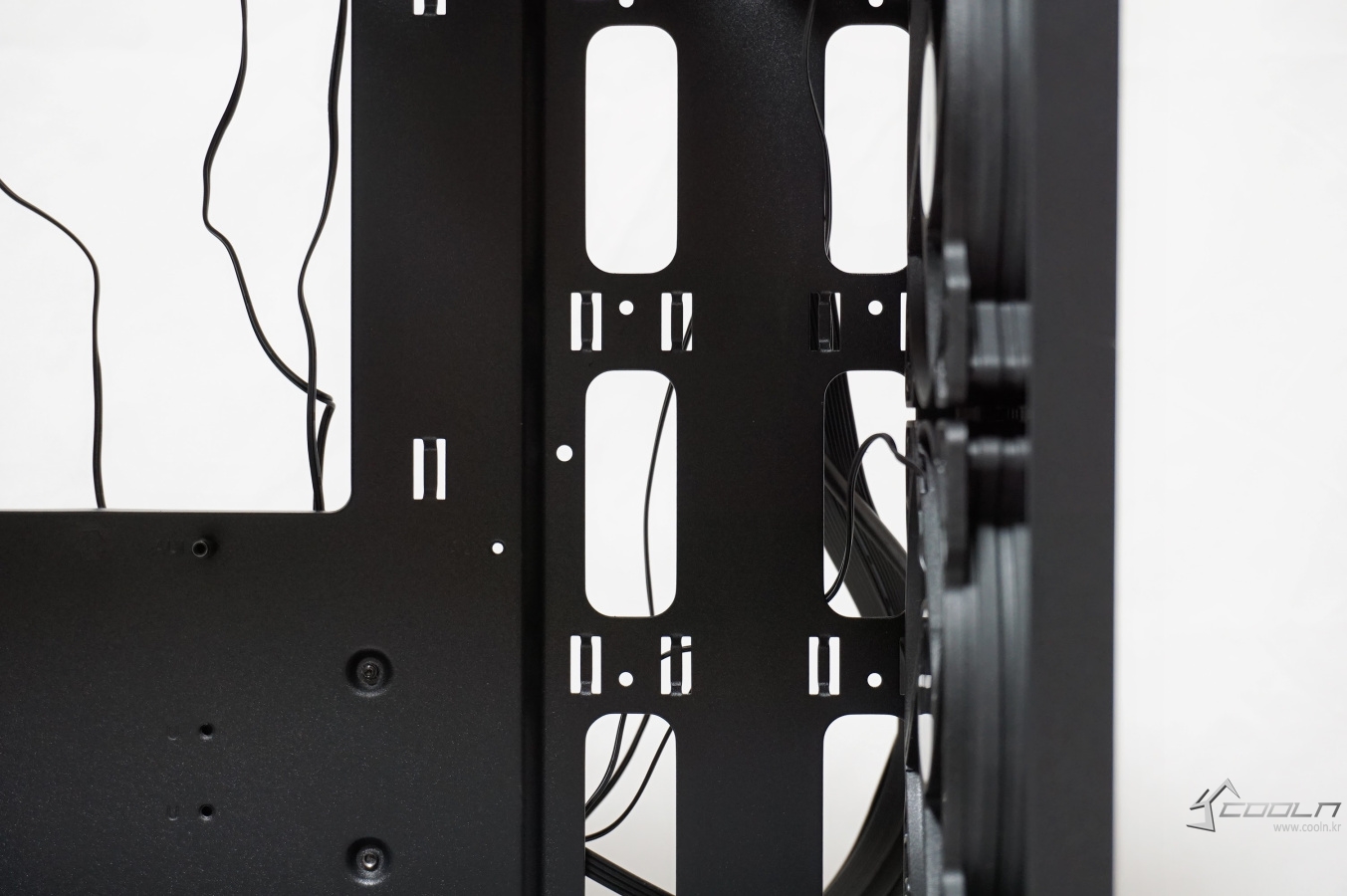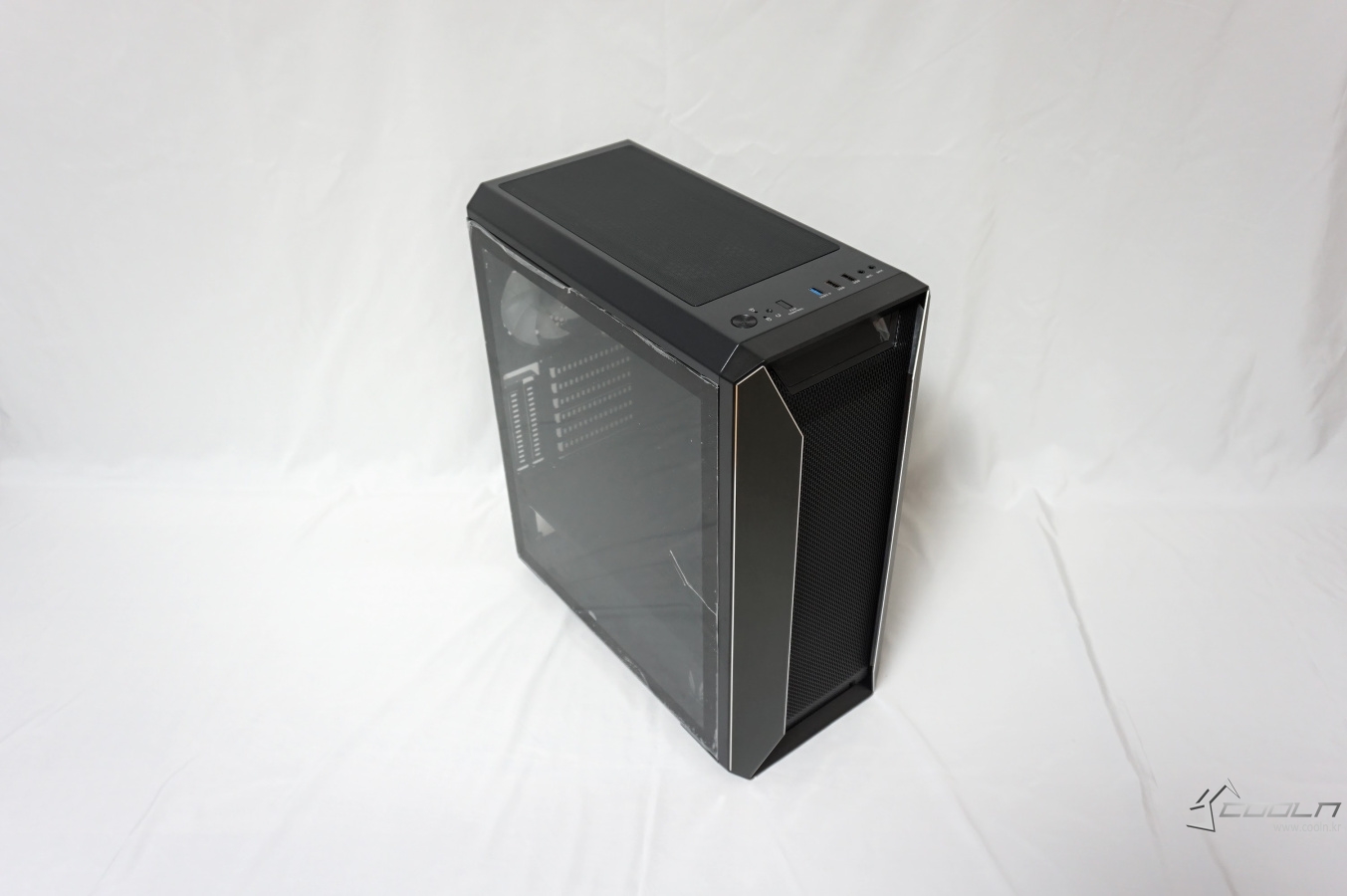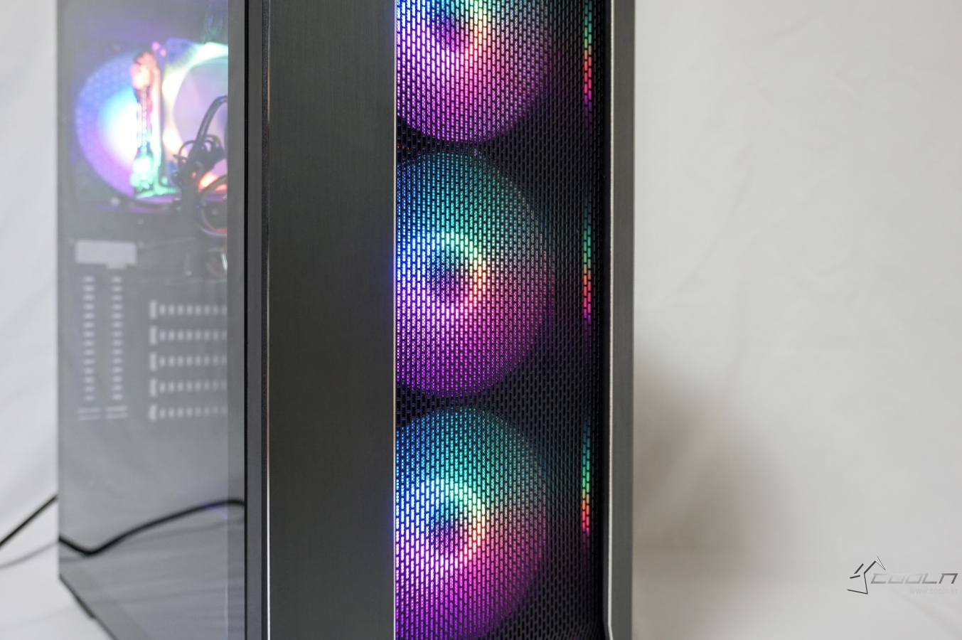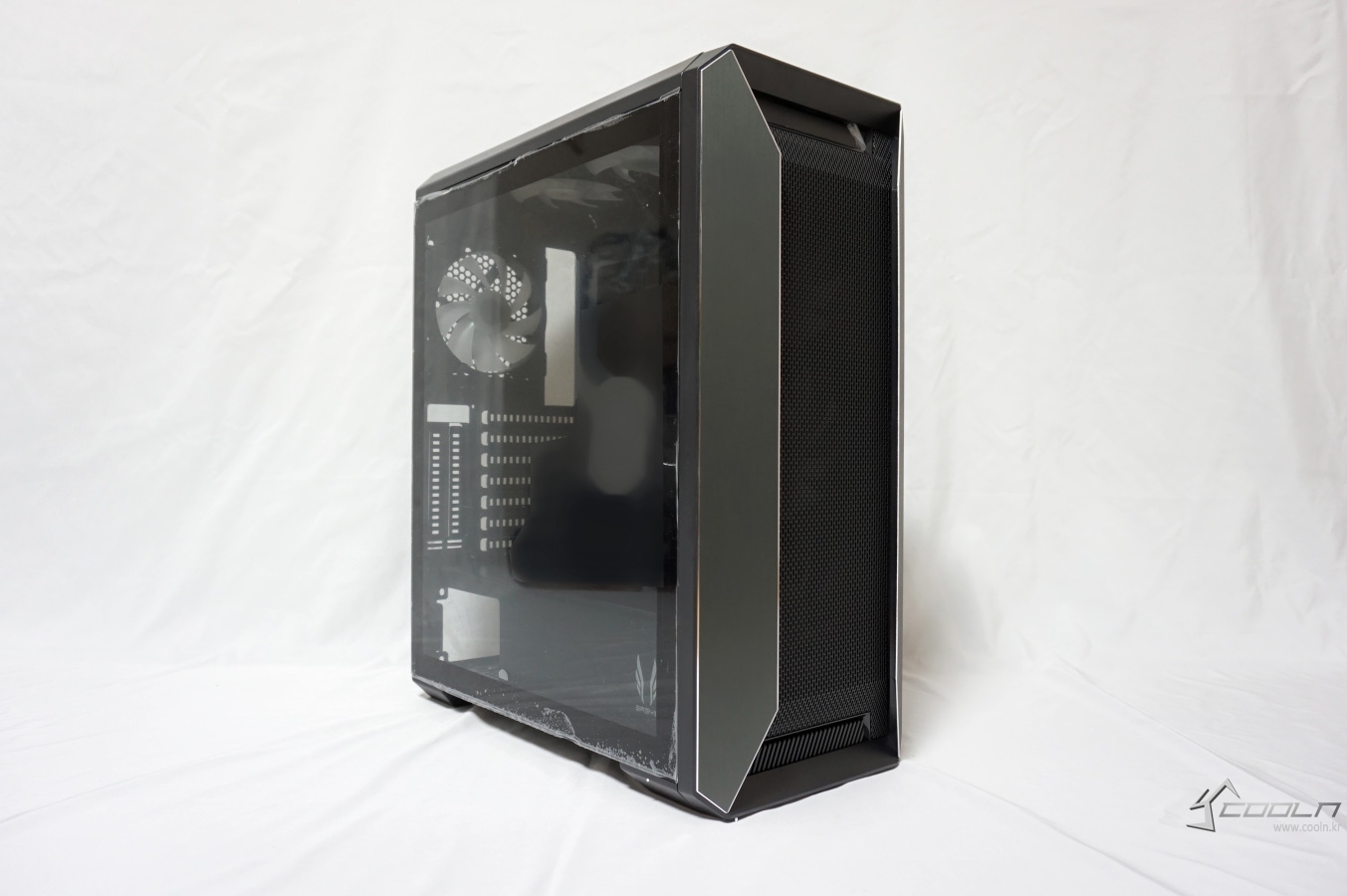 양쪽의 알루미늄 패널은 베젤 사이드를 감싸는 듯한 디자인으로 되어 있으며 이 패널과 베젤과의 약간의 틈이 있는 것을 확인할 수 있습니다. 또한 전면의 풀 사이즈 메쉬 타공망은 내부의 장착된 팬이 보일 정도로 비침이 있습니다.