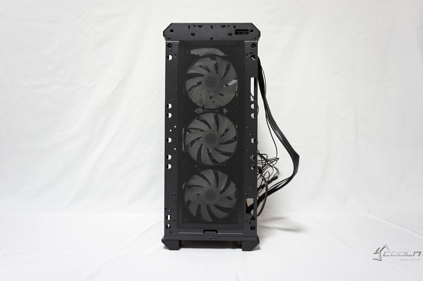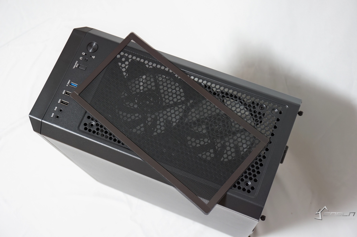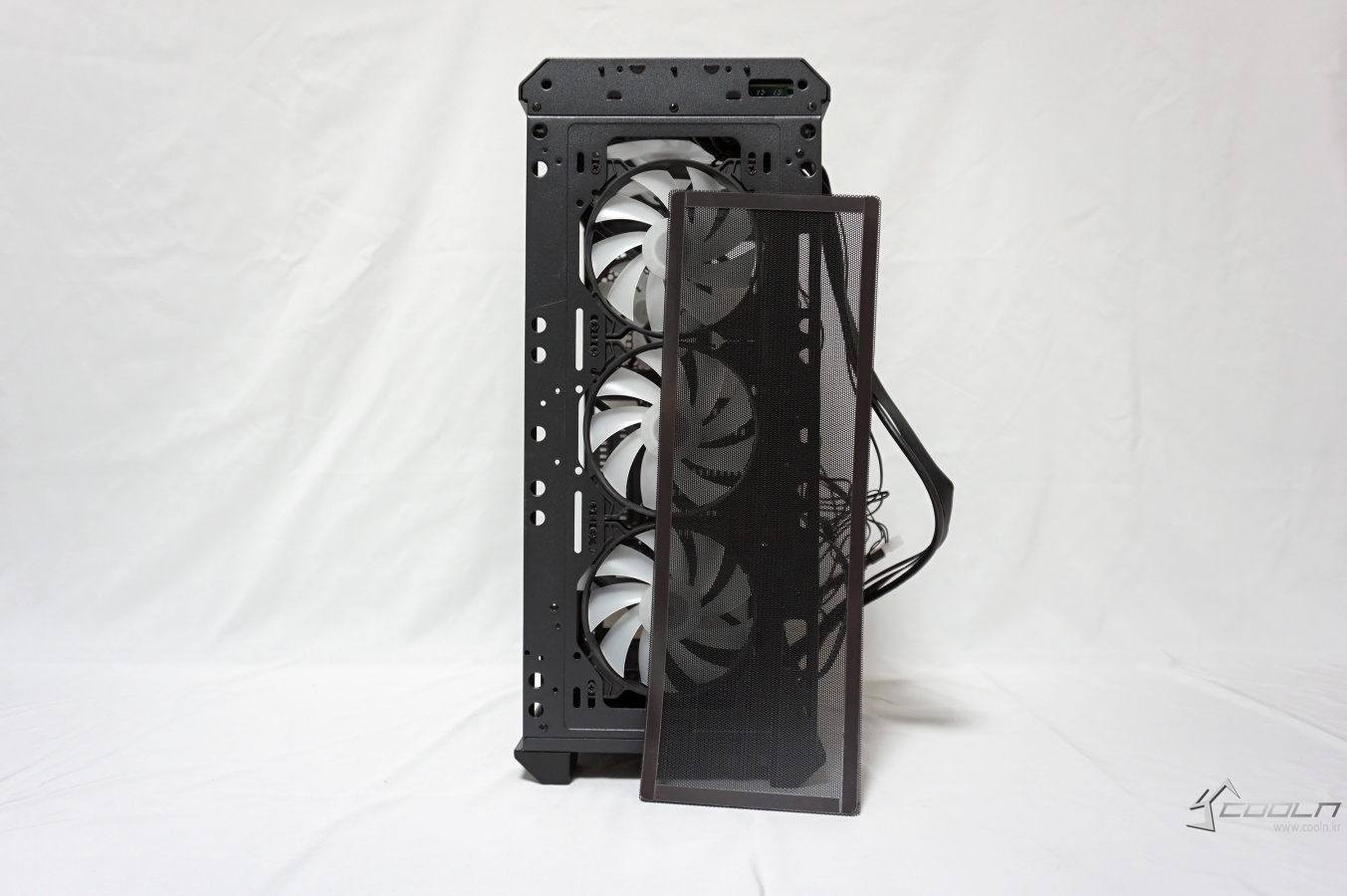 상단부에는 자석식 먼지 필터가 부착되어 있으며 120mm 팬 2개가 장착되어 있습니다.