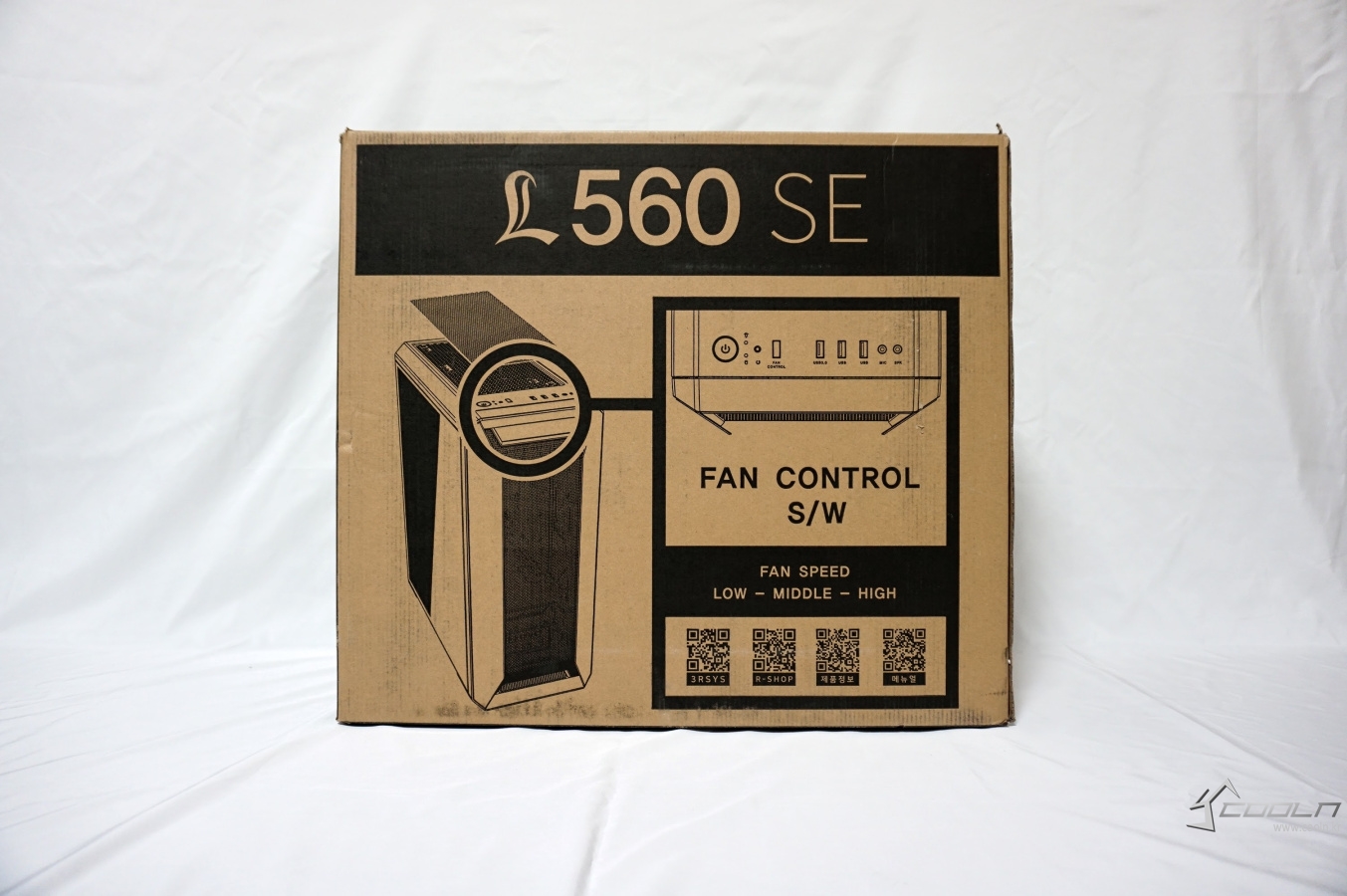 보급형 케이스의 특징으로 측면 아크릴 또는 강화유리, LED 팬 그리고 파워 서플라이 체임버 분리 구조 등이 있습니다. 그 외에 LED 컨트롤이나 팬 장착 방식같이 부가적인 요소들의 차이점이 있지만 대부분의 제품들이 약간의 외형적인 차이가 있을 뿐 그렇게 큰 차이점은 없다시피 합니다. 3RSYS L560 SE는 기존의 보급형 케이스와 마찬가지로 보급형 튜닝 케이스를 지향하고 있는 제품으로 이름에서 알 수 있듯이 자사의 L560의 개선판 제품입니다. 주요 특징으로 기본 제공되는 번들 팬의 성능이 좋지 않다는 편견을 깨고자 하였는지 MOON FAN 3을 제공하고 있으며 기존 L560에는 없었던 팬 컨트롤이 추가되었습니다.