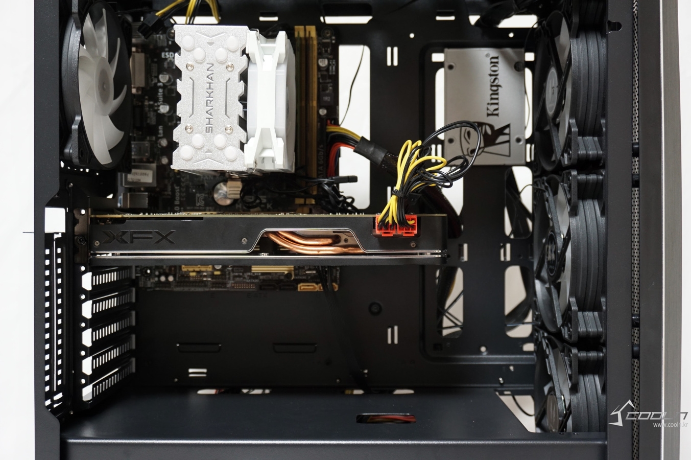 장착 가능한 CPU 쿨러 높이, VGA 길이 모두 무난한 편. SSD 장착은 가능하면 측면의 전용 가이드를 사용하는 것을 권장합니다. 선 정리 홀에도 부착하여 사용할 수 있으나 선 정리 홀 일부를 가리게 되므로 가능하면 사용하고 싶지 않습니다. VGA 수직 장착이 가능한데 PCI 슬롯 외에 고정시키는 것이 없어 사용하게 된다면 흔들림이 있을 것으로 예상됩니다. 공식 답변에서도 사용 가능합니다.라고 말하지만 이전의 VGA 수직 장착 가능한 케이스들이 제대로 고정시킬 수 있는 것을 이유 없이 제공하지는 않았을 테니 말 그대로 장착은 가능합니다.라고 말할 수 있습니다.
