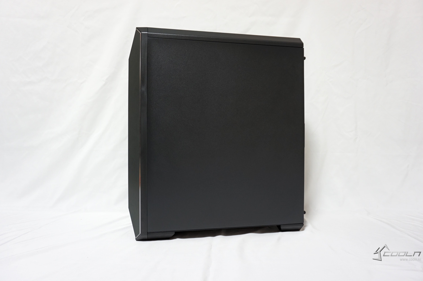 풀사이즈 강화 유리를 확인할 수 있으며 대대수 케이스들이 측면에 손 나사로 결합하는 방식을 사용하는 것에 비해 후면에 손 나사로 결합되는 방식을 사용하여 측면에는 어떠한 돌출된 요소도 없습니다. 반대쪽 패널 역시 평평한 형태로 되어 있습니다.