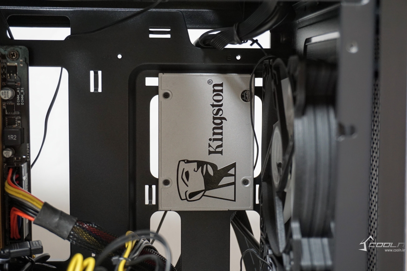 SSD를 위 이미지같이 장착하게 되면 선 정리 홀 일부를 가리게 됩니다.