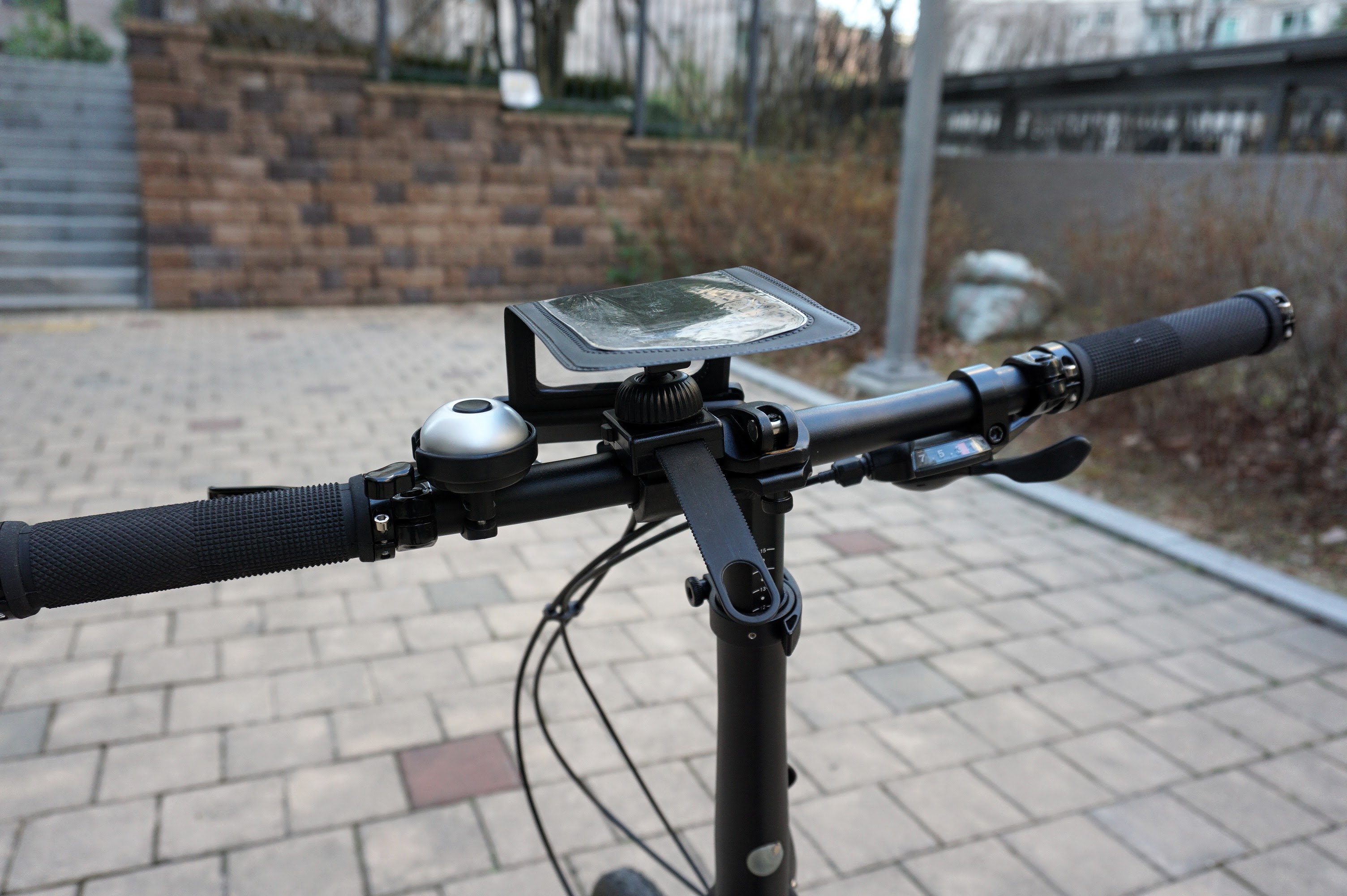거치대 고정은 테이프같이 보이는 부속품을 당겨 고정시키며 다시 풀고 싶다면 거치대 본체의 네모난 부분의 버튼 같은 것을 누르면 됩니다. 다만 한 가지 주의 점은 거치대를 미니벨로에 거치하였는데 핸들바 두께가 얇아서인지 제공하는 고정 고무패드 3개를 다 사용하면 고정시킬 수 없었습니다. 조립에는 고무패드 2개만 사용하여 고정하였습니다.
