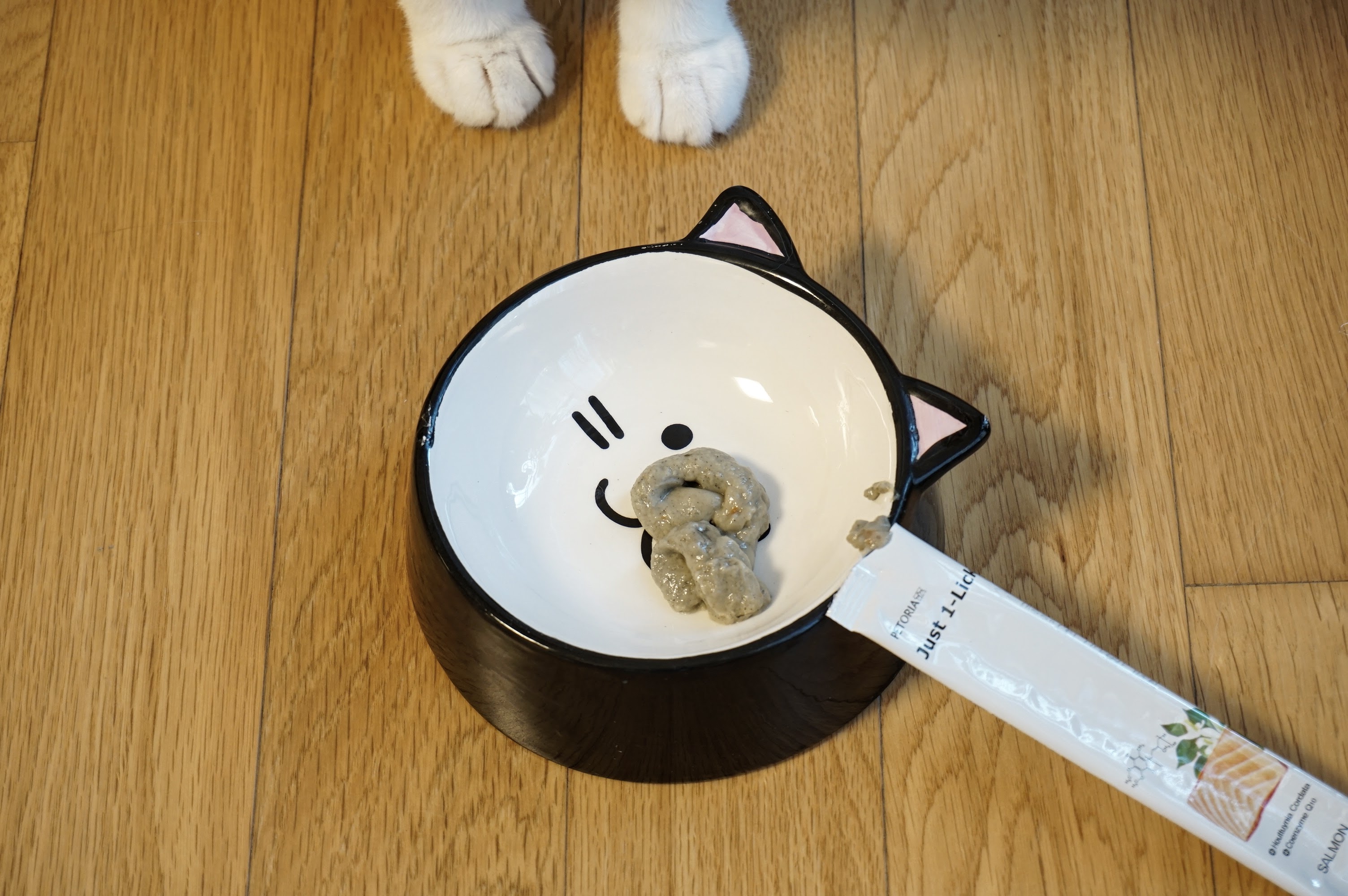 이후에 츄르를 개봉하여 잘 먹는 모습을 촬영하려고 했으나 냄새만 맡을 뿐 먹지는 않았습니다. 어성초가 포함되어 있어 약간 약초 냄새가 나서 그런 것인지 관심을 보이기는 하지만 먹지는 않았습니다. 혹시나 해서 밥그릇에 담아 놓았는데 마찬가지였습니다.