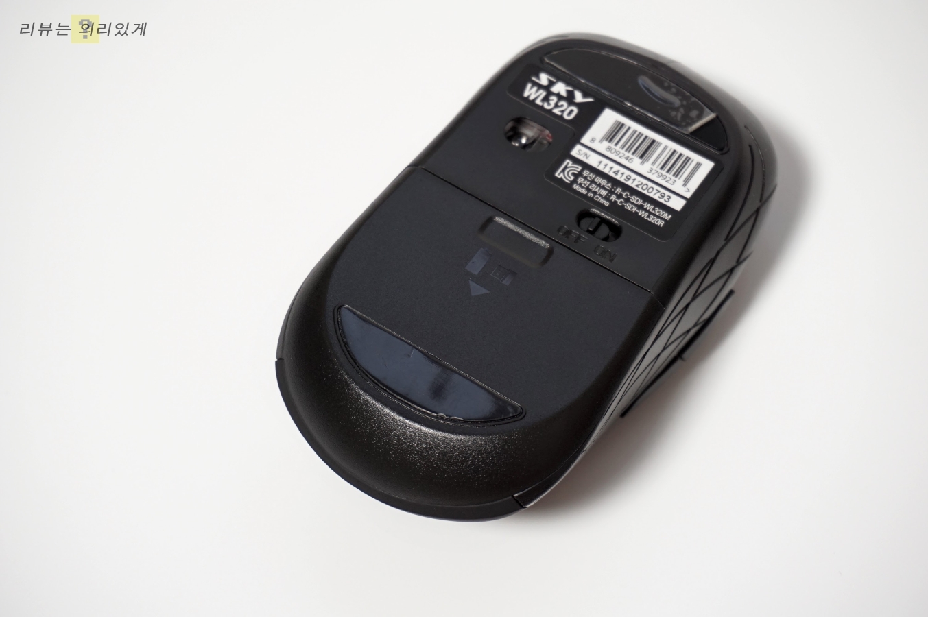 마우스에도 ON/OFF 버튼이 있으며 하단에는 건전지 투입구와 리시버 보관함이 있습니다.