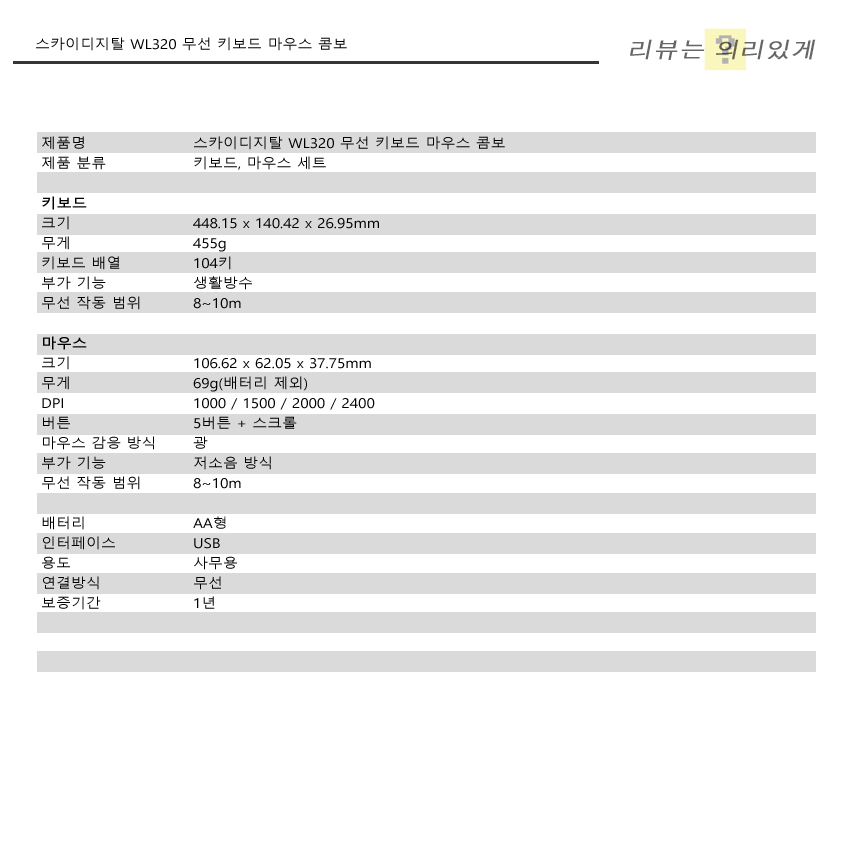 스카이디지탈 WL320 콤보 세트는 보급형 키보드 가격대로 출시가 되었음에도 키보드와 마우스를 동시에 사용할 수 있으며 USB A, C 타입을 지원하는 듀얼 리시버 방식을 사용하는 등 여러 편의성을 고려한 제품이라 할 수 있습니다. 그러나 키보드 받침이나 마우스 무게 중심 같은 것에서 가격대 한계성을 확인할 수 있는데 키보드는 그렇다 치더라도 마우스는 계속 사용하고 있으니 앞은 가볍고 뒤는 무거운 이상한 느낌을 자꾸 지울 수 없었습니다. 이것만 제외한다면 사무용으로 쓰기에 좋은 제품이라 생각합니다.