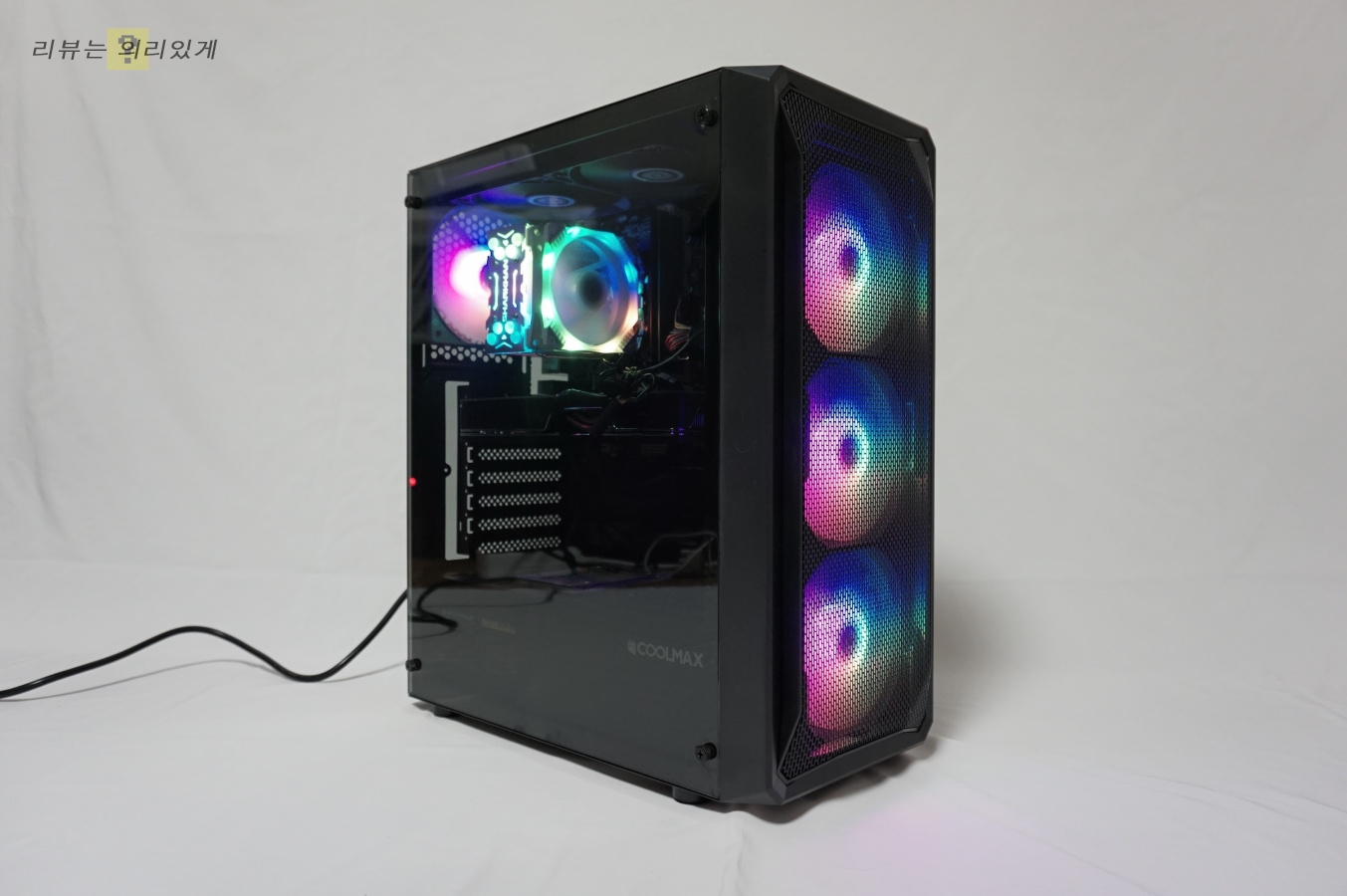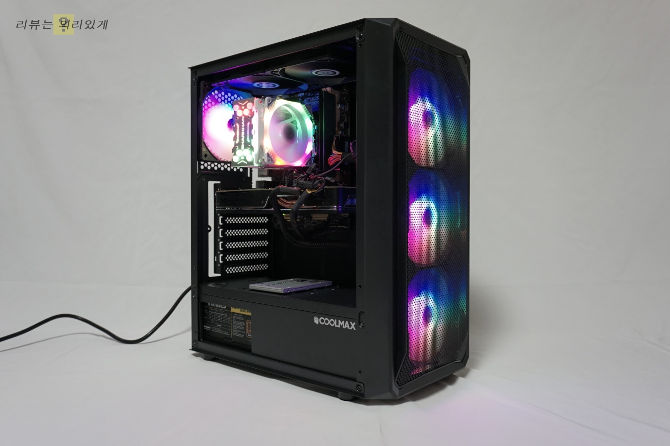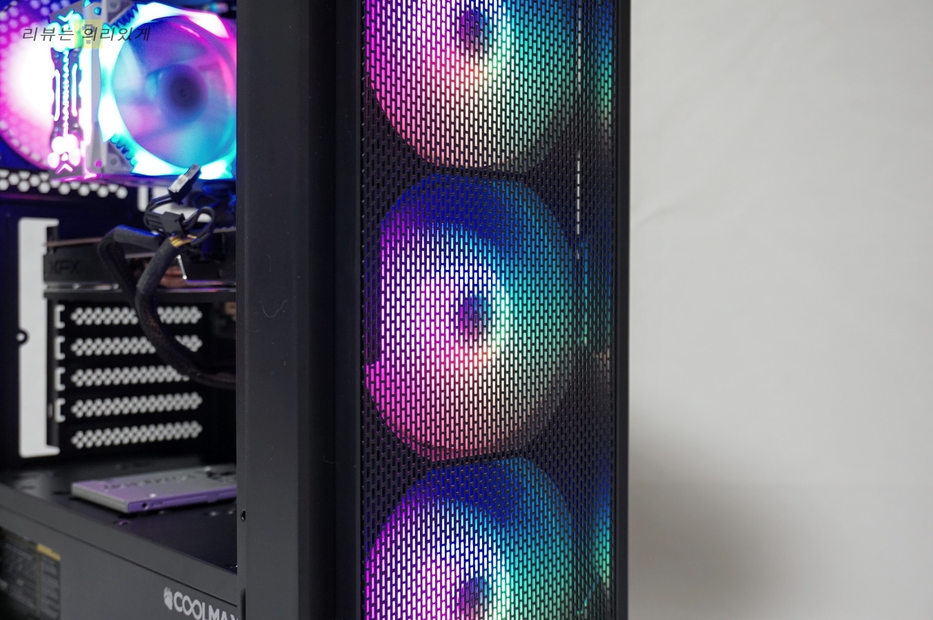번들 팬 6개 제공으로(2개는 LED 팬 아님) 팬 추가 없이 충분한 쿨링이 가능합니다. 다만 가격대 때문인지 상단 팬은 LED가 아니며 LED 팬은 다양한 색상이 한 번에 나오는 방식을 사용하고 있습니다. 측면 아크릴은 스모그 처리가 약간 되어 있어 약간 어둡게 느껴질 수 있습니다. 일체감은 없지만 최대한 팬을 장착하려는 의도가 보여 괜찮게 생각합니다.