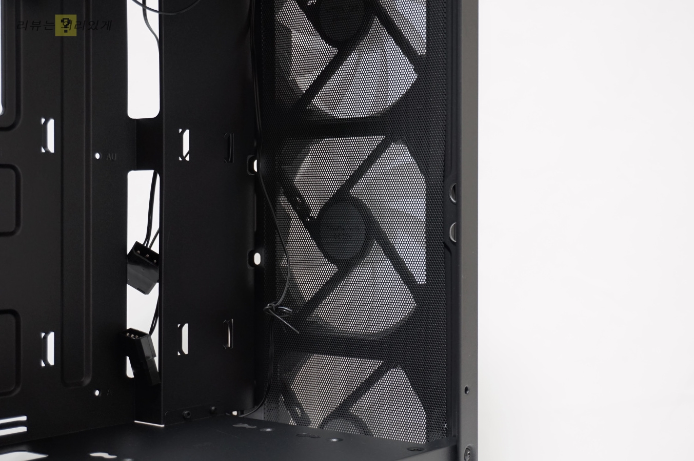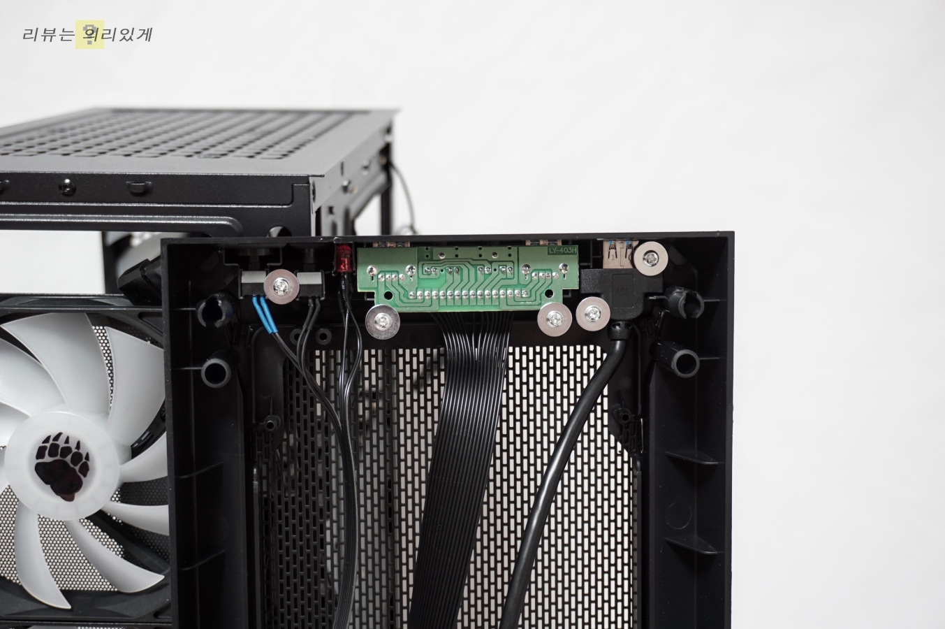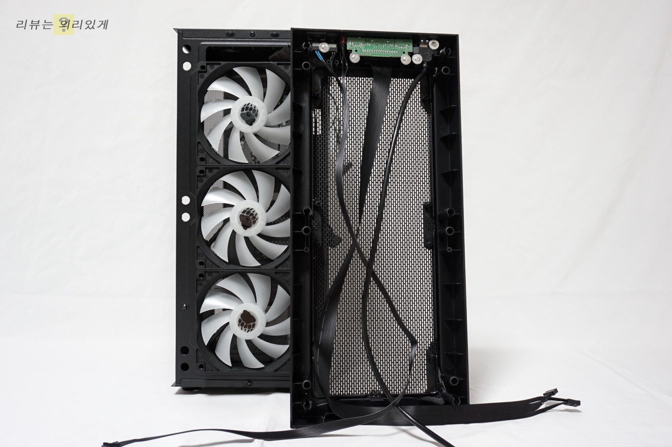 측면 아크릴이 있는 것과 없는 것을 비교했을 때 아크릴에 스모그 처리가 되어 있음을 확인할 수 있었습니다. 또한 전면, 후면 팬과 다르게 상단 팬은 LED가 아니었습니다. 가격대를 생각한다면 어쩔 수 없는 부분. LED 모드 변경 같은 옵션 또한 지원하지 않습니다.