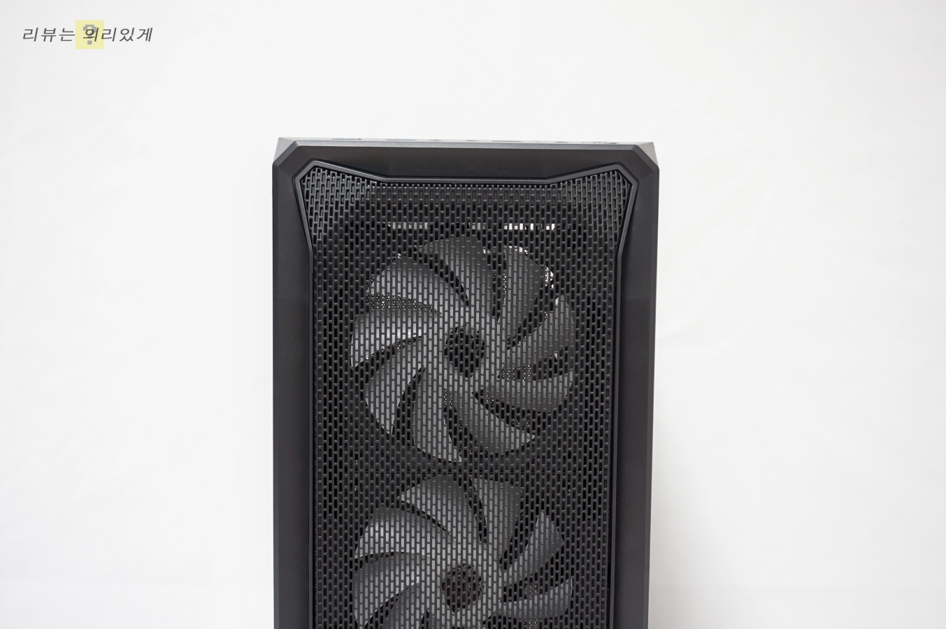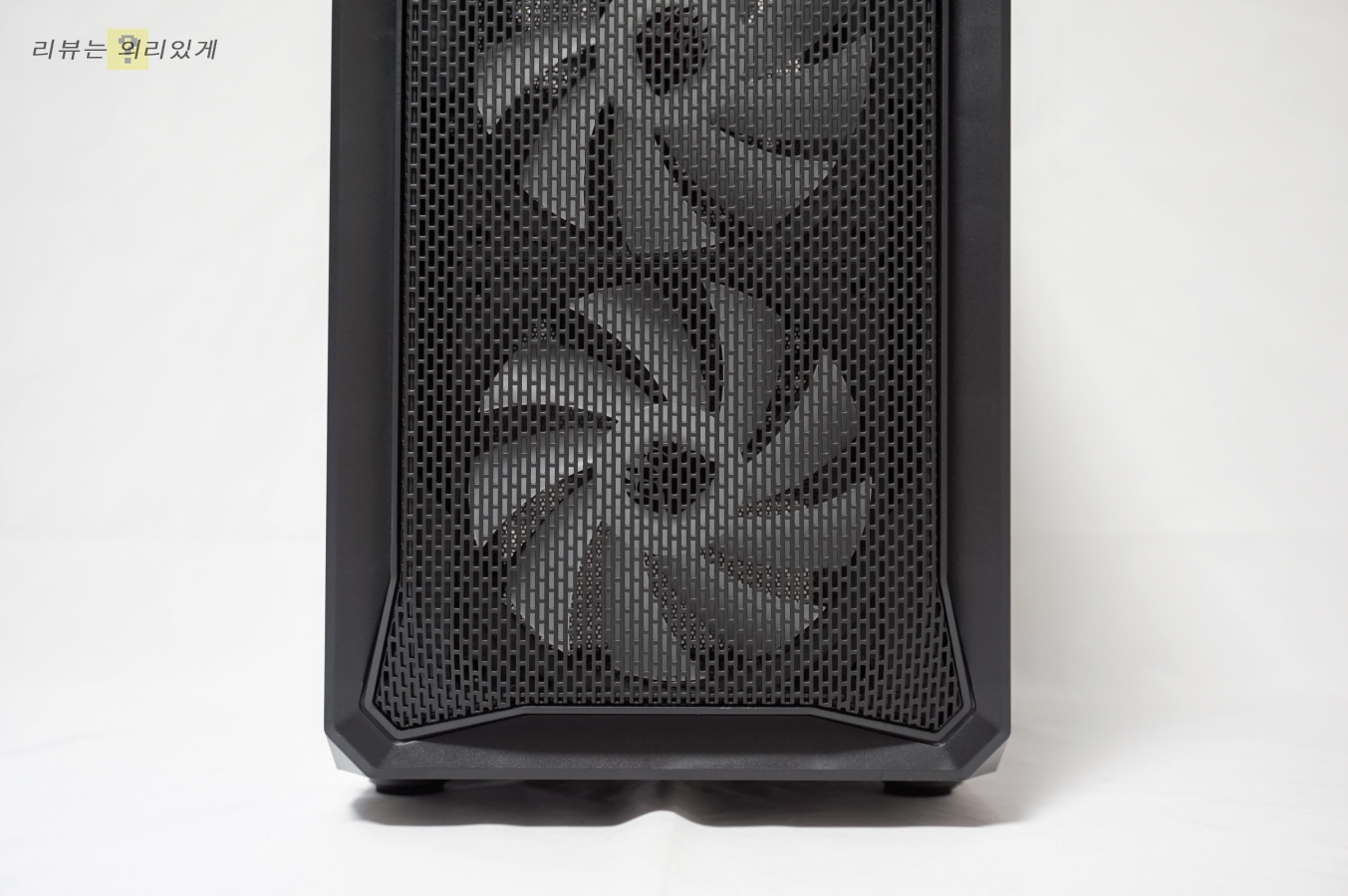 제품 전면부는 알루미늄 소재의 메쉬 타공 구조로 되어 있으며 케이스와 전면부가 연결성 있도록 한 포인트 디자인이 존재합니다.