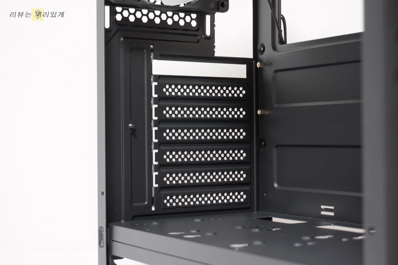 4+4핀 보조전원 선 정리 홀은 메인보드 보다 위쪽에 위치해 있습니다.