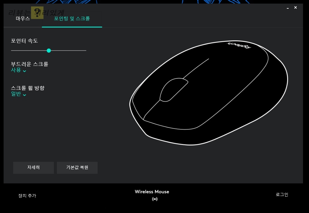 포인터 속도, 스크롤, 휠 방향같이 단순한 옵션만 변경이 가능합니다. 소프트웨어에도 DPI 변경 옵션이 없는 것으로 보아 DPI는 1000으로 고정되어 사용하는 제품으로 생각됩니다.