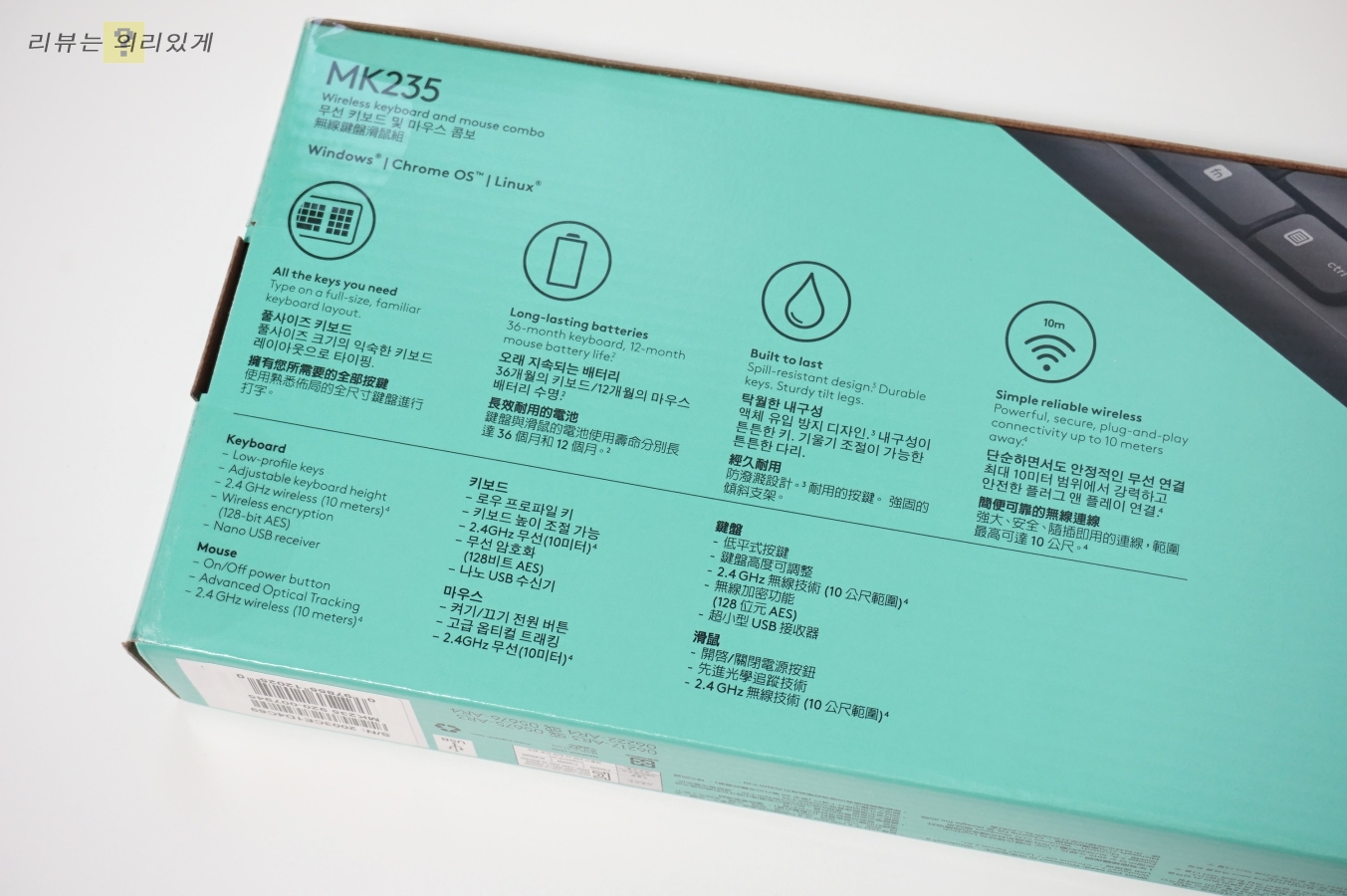 제품 스펙과 특징에 대한 설명을 확인할 수 있습니다. 키보드와 마우스는 각각 36개월, 12개월 사용이 가능하여 상당히 긴 사용 시간을 자랑합니다.