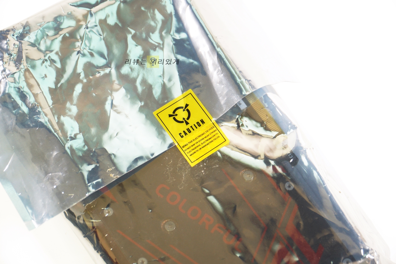 제품은 정전기 방지 비닐에 포장되어 있으며 스티로폼으로 그래픽카드를 보호하고 있는 모습.