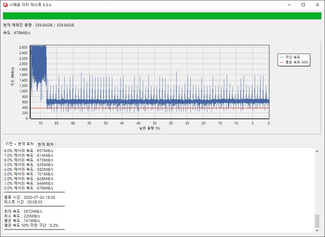 50% 미만 구간은 0.2%로 측정되었으며 최대 2672MB/s, 최소 220MB/s, 평균 741MB/s로 측정되었습니다.